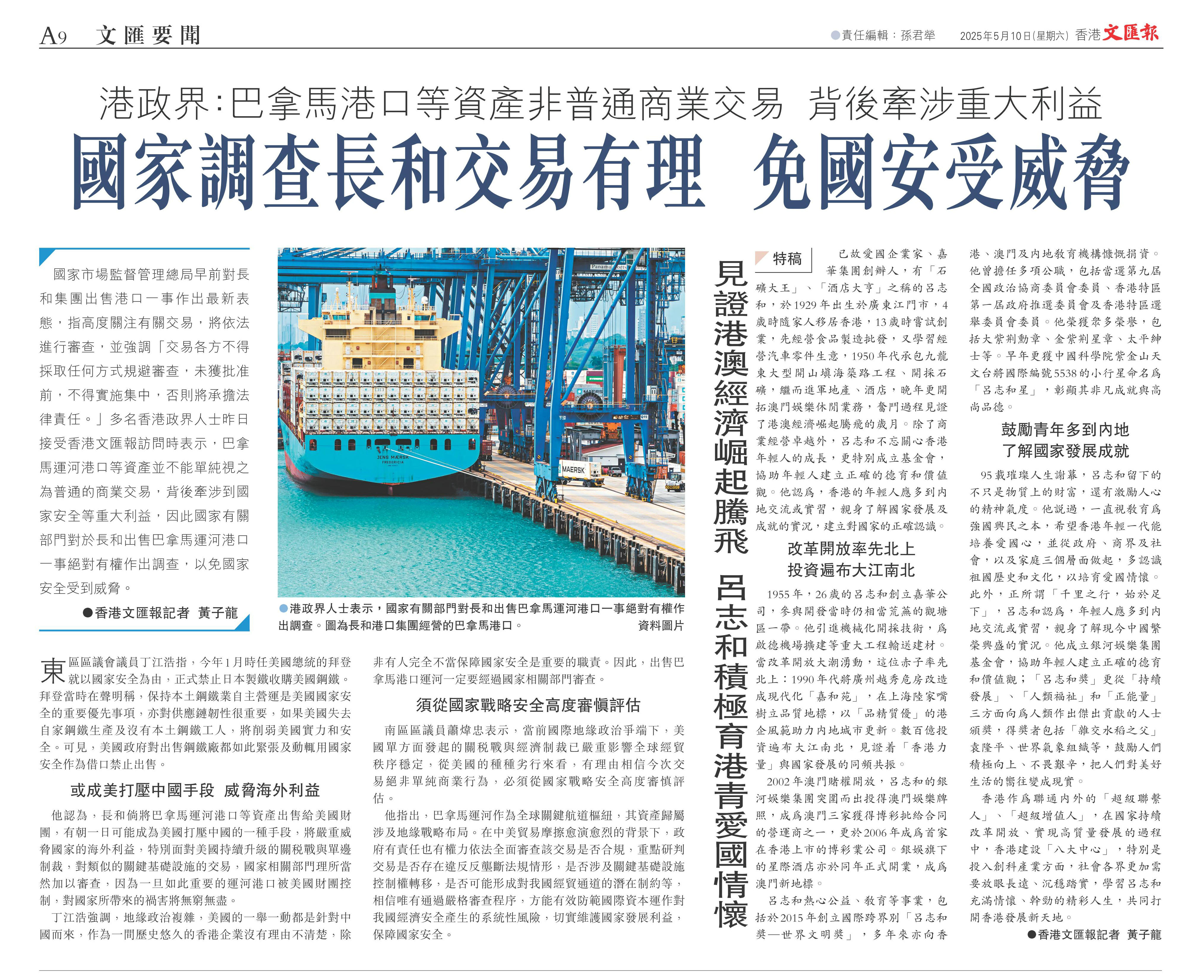 他認為,長和倘將巴拿馬運河港口等資產出售給美國財團,有朝一日可能成為美國打壓中國的一種手段,將嚴重威脅國家的海外利益,特別面對美國持續升級的關稅戰與單邊制裁,對類似的關鍵基礎設施的交易,國家相關部門理所當然加以審查,因為一旦如此重要的運河港口被美國財團控制,對國家所帶來的禍害將無窮無盡。