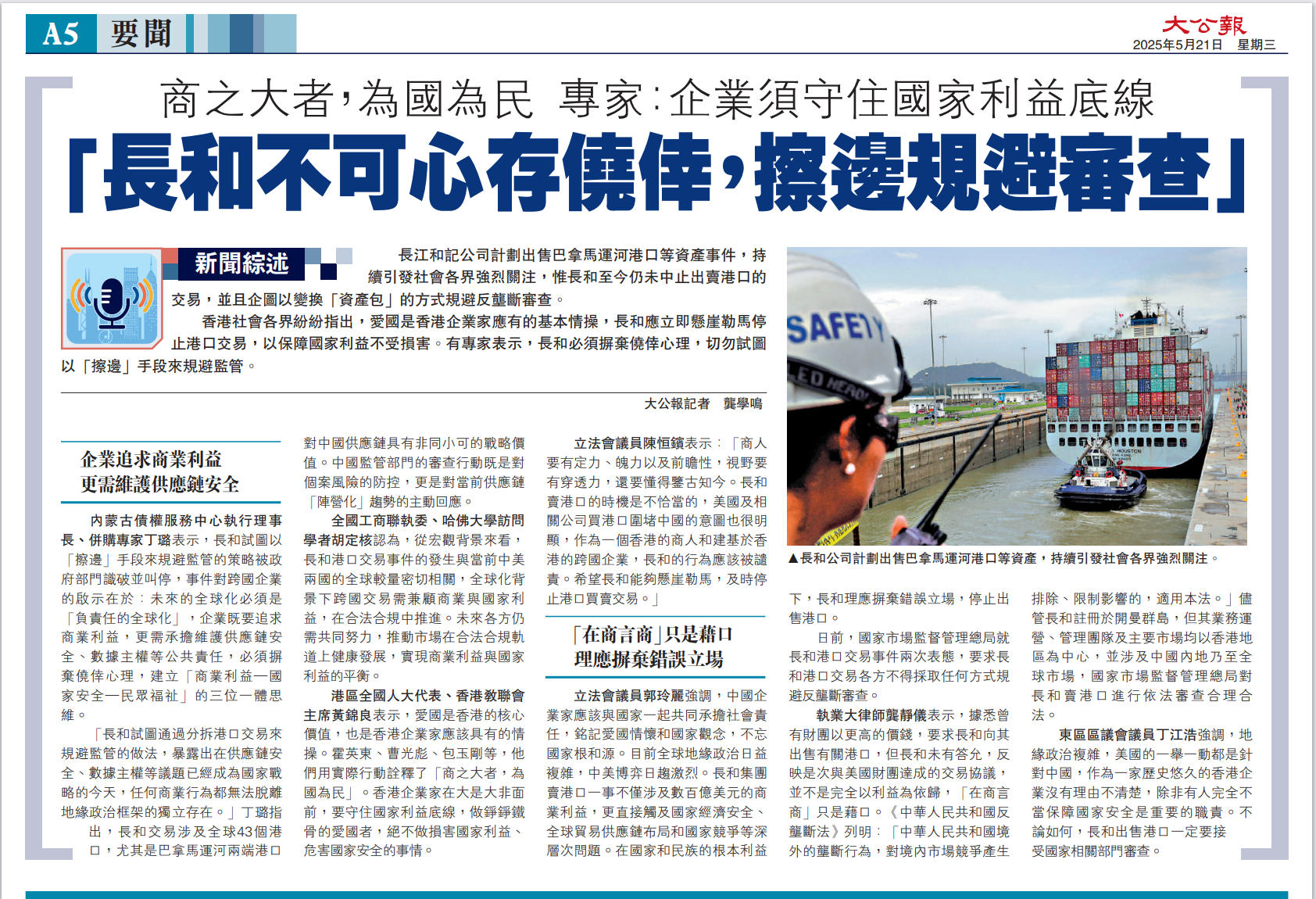 香港社會各界紛紛指出,愛國是香港企業家應有的基本情操,長和應立即懸崖勒馬停止港口交易,以保障國家利益不受損害。有專家表示,長和必須摒棄僥幸心理,切勿試圖以「擦邊」手段來規避監管。 \大公報記者龔學鳴