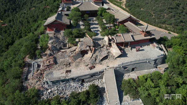 6月3日,太原市太山博物館發布閉館公告,稱因近期發生地質災害,即日起將臨時閉館。4日,央廣網記者實地探訪事發地,航拍畫面顯示, 山上部分建筑坍塌嚴重,建筑外圍一處山體出現大坑,大量黃土裸露。