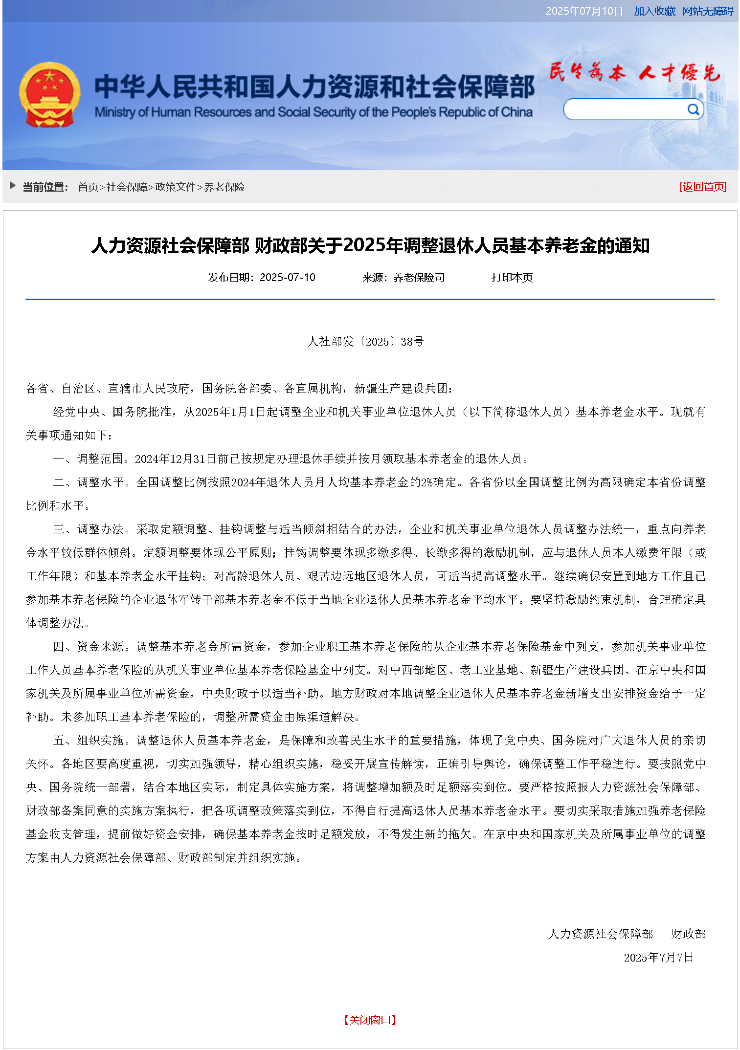 人力資源社會保障部 財政部關(guān)于2025年調(diào)整退休人員基本養(yǎng)老金的通知