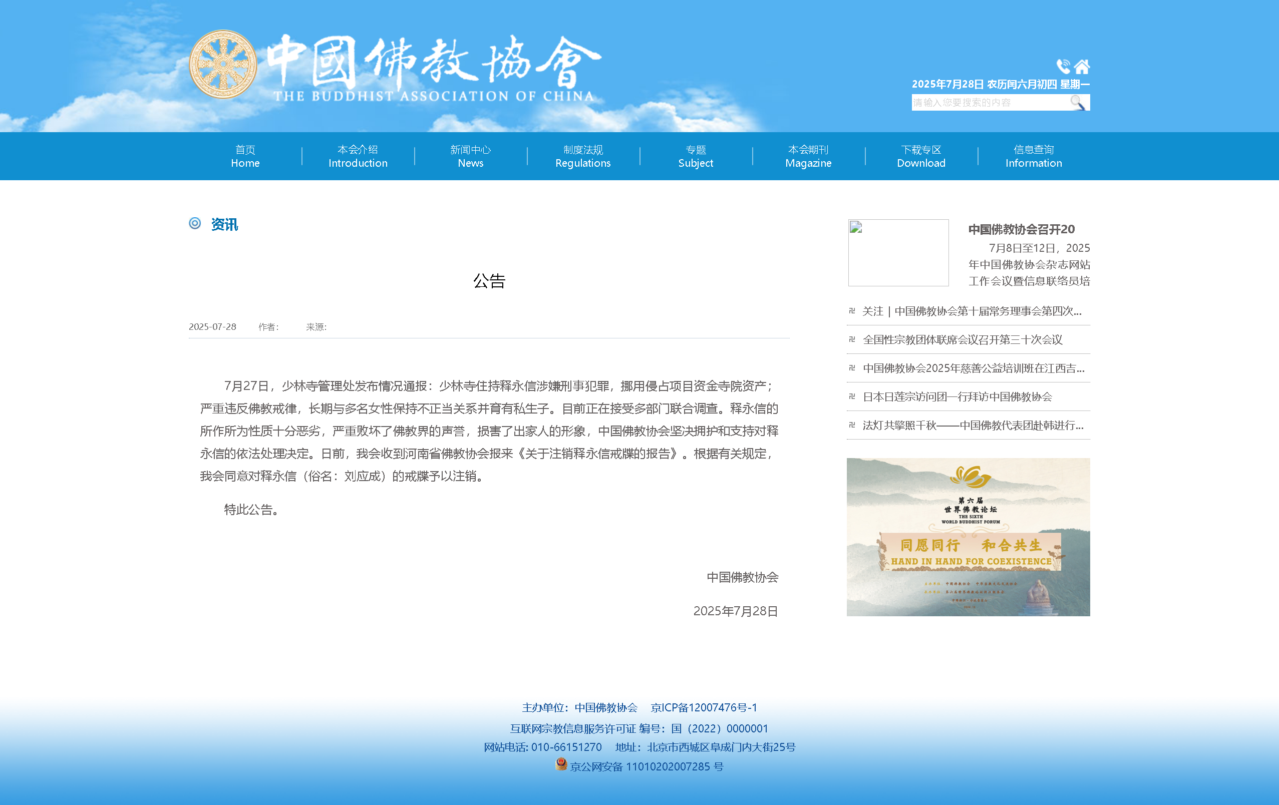 7月27日,少林寺管理處發(fā)布情況通報:少林寺住持釋永信涉嫌刑事犯罪,挪用侵占項目資金寺院資產(chǎn);嚴重違反佛教戒律,長期與多名女性保持不正當關系并育有私生子。目前正在接受多部門聯(lián)合調(diào)查。釋永信的所作所為性質(zhì)十分惡劣,嚴重敗壞了佛教界的聲譽,損害了出家人的形象,中國佛教協(xié)會堅決擁護和支持對釋永信的依法處理決定。日前,我會收到河南省佛教協(xié)會報來《關于注銷釋永信戒牒的報告》。根據(jù)有關規(guī)定,我會同意對釋永信(俗名:劉應成)的戒牒予以注銷。