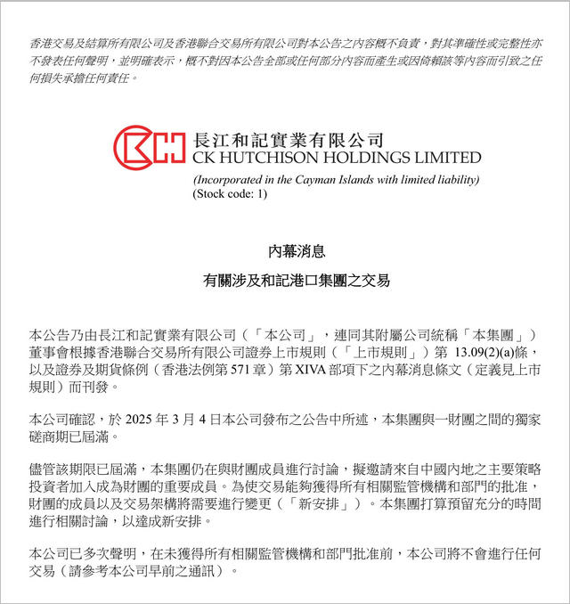 28日早間,長和發布公告表示公司與一財團之間的獨家磋商期已屆滿。盡管該期限已屆滿,集團仍在與財團成員進行討論,擬邀請來自中國內地的主要策略投資者加入成為財團的重要成員。長和在公告中提到,為使交易能夠獲得所有相關監管機構和部門的批準,財團的成員以及交易架構將需要進行變更。集團打算預留充分的時間進行相關討論,以達成新安排。