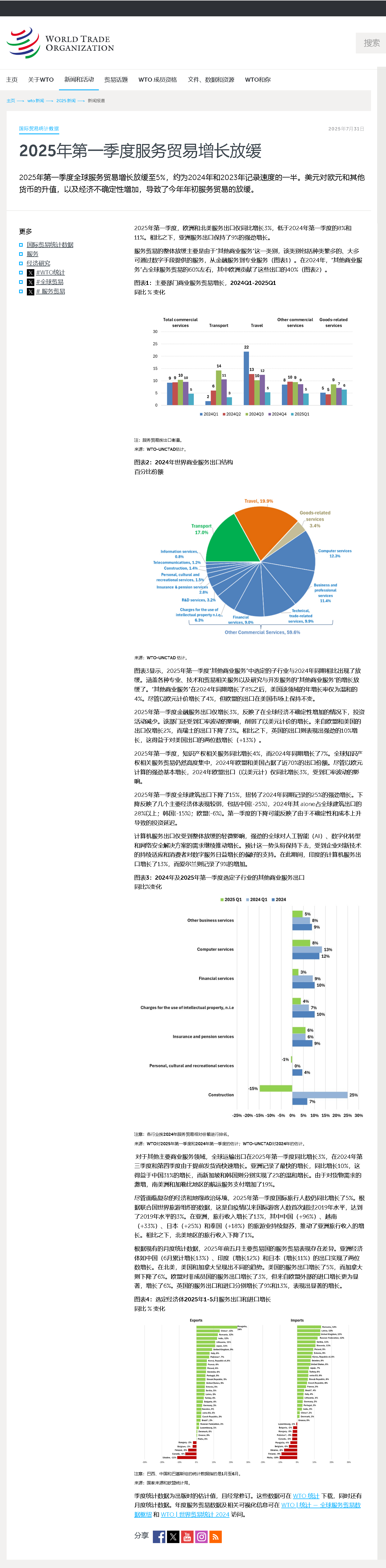 當地時間7月31日,世貿組織發布最新數據顯示,2025年第一季度,全球服務貿易增速放緩至同比增長5%,約為2024年和2023年增速的一半。