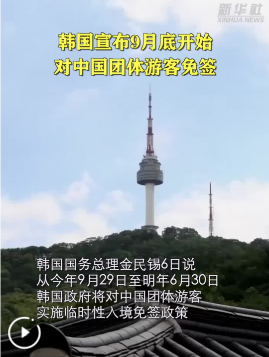 新華社首爾8月6日電(記者陸睿 黃昕欣)韓國國務(wù)總理金民錫6日說,從今年9月29日至明年6月30日,韓國政府將對中國團(tuán)體游客實(shí)施臨時(shí)性入境免簽政策。