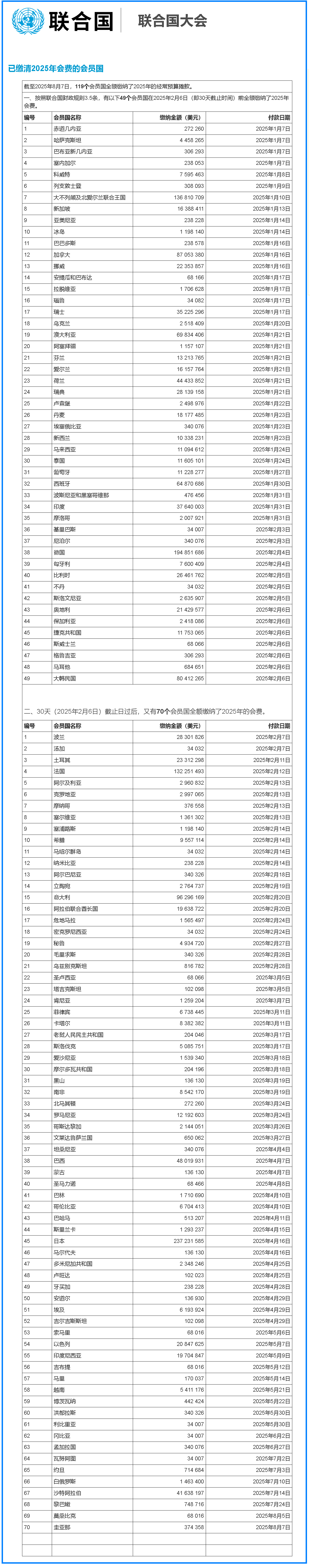 二、30天(2025年2月6日)截止日過后,又有70個會員國全額繳納了2025年的會費。