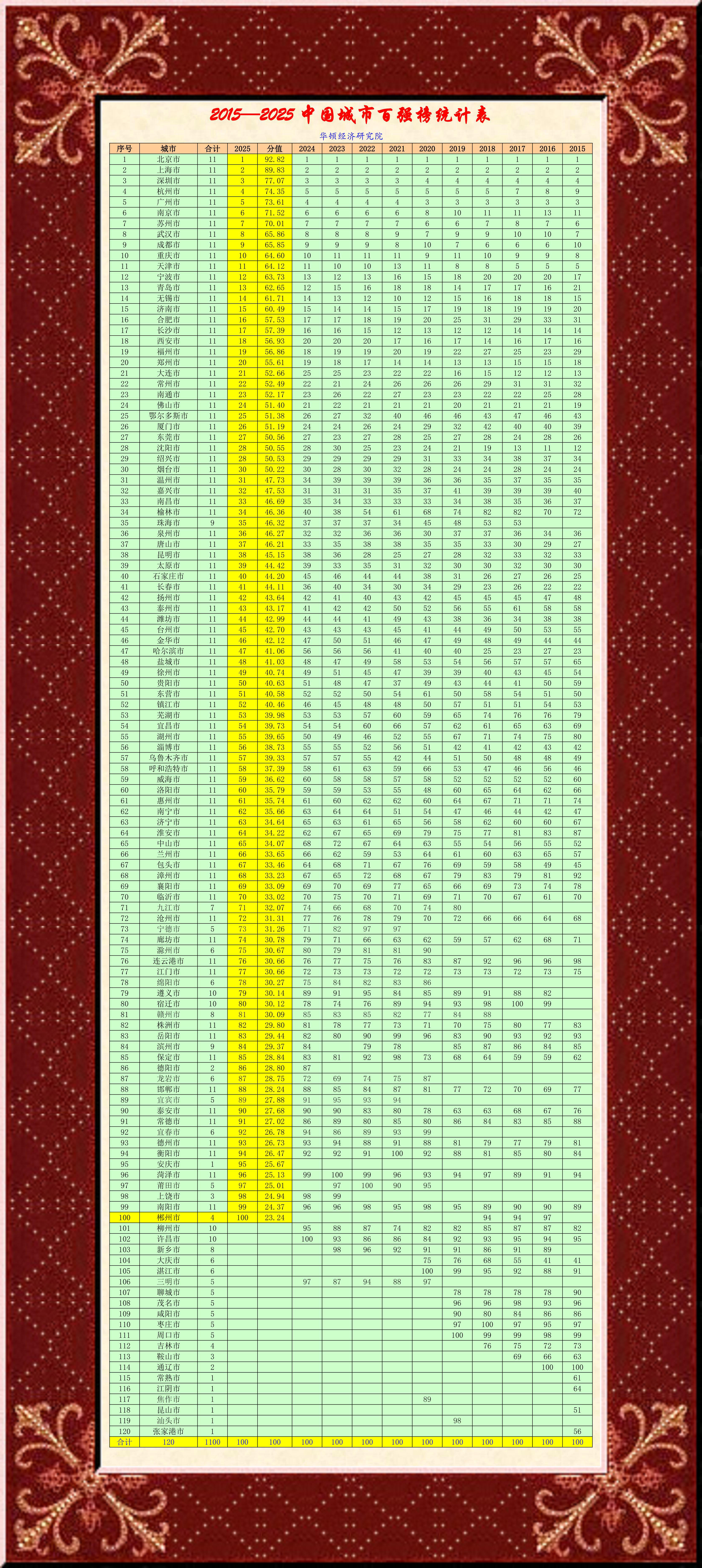 近日,華頓經濟研究院在上海發布2025年中國百強城市排行榜。太原市榜上有名,以44.42分的綜合得分,位列第39位,與2024年排名持平。