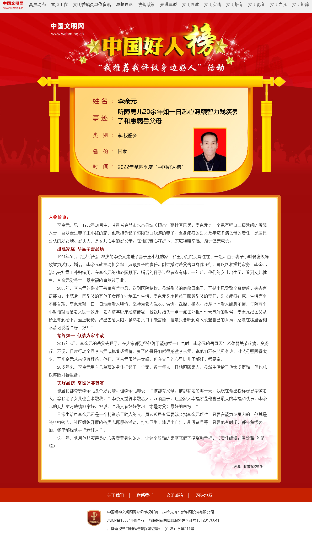 這個(gè)人叫李余元。27歲時(shí),一場(chǎng)意外讓他失去了聽力,被診斷為終身聽力二級(jí)殘疾。35歲時(shí),經(jīng)人介紹,李余元和有智力殘疾的王小紅組建了家庭,他擔(dān)負(fù)起照顧妻子的責(zé)任。在他的精心呵護(hù)下,家庭和睦幸福,孩子健康成長。2022年,他榮登第四季度“中國好人榜”。