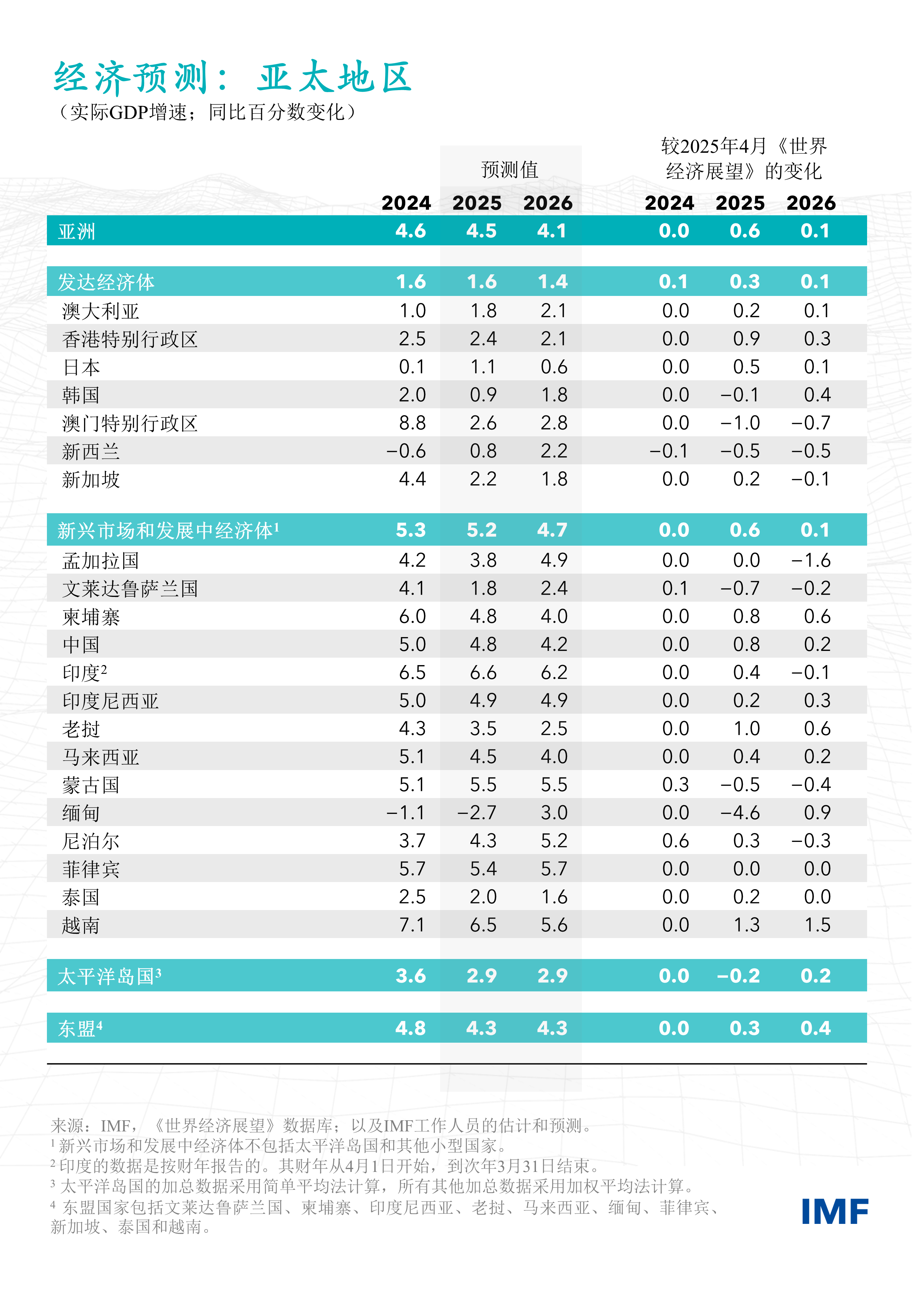 新華社香港10月24日電(黃茜恬)國際貨幣基金組織(IMF)24日在香港發布最新一期亞太地區經濟展望報告,預計2025年亞太地區經濟增速為4.5%,比4月預測提高0.6個百分點。