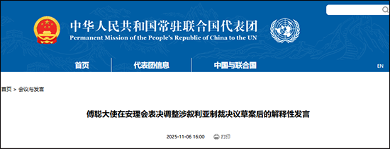 中國常駐聯合國代表團網站11月6日消息,中國常駐聯合國代表傅聰大使在安理會表決調整涉敘利亞制裁決議草案后作解釋性發言,對決議未能回應有關各方合理關切表示遺憾。