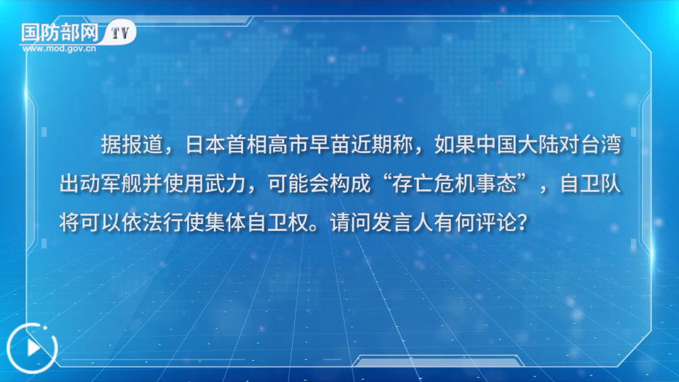 記者:據(jù)報道,日本首相高市早苗近期稱,如果中國大陸對臺灣出動軍艦并使用武力,可能會構成“存亡危機事態(tài)”,自衛(wèi)隊將可以依法行使集體自衛(wèi)權。請問發(fā)言人有何評論?