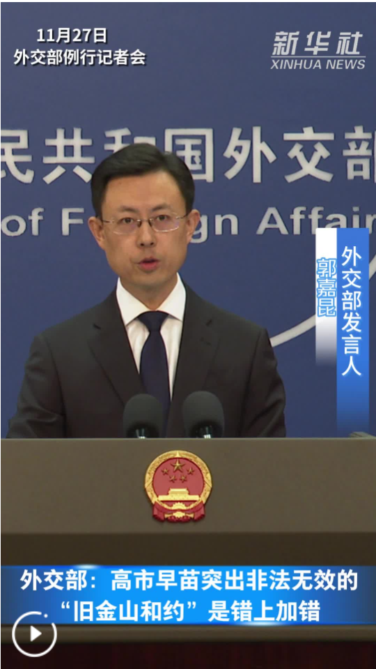 高市早苗首相對具有充分國際法效力且在《中日聯合聲明》和《中日和平友好條約》等雙邊文件中明確強調的《開羅宣言》《波茨坦公告》避而不談,卻唯一突出非法無效的“舊金山和約”,這再次表明,她時至今日仍不思悔改,仍在持續損害中日四個政治文件精神確定的中日關系政治基礎,無視聯合國權威,公然挑戰戰后國際秩序和國際法基本準則,甚至妄圖煽炒所謂“臺灣地位未定論”。這是錯上加錯,中方對此堅決反對,國際社會也應高度警惕。我們再次敦促日方切實反思糾錯,撤回錯誤言論,以實際行動體現對華承諾,以實際行動履行作為聯合國會員國起碼應盡的義務。