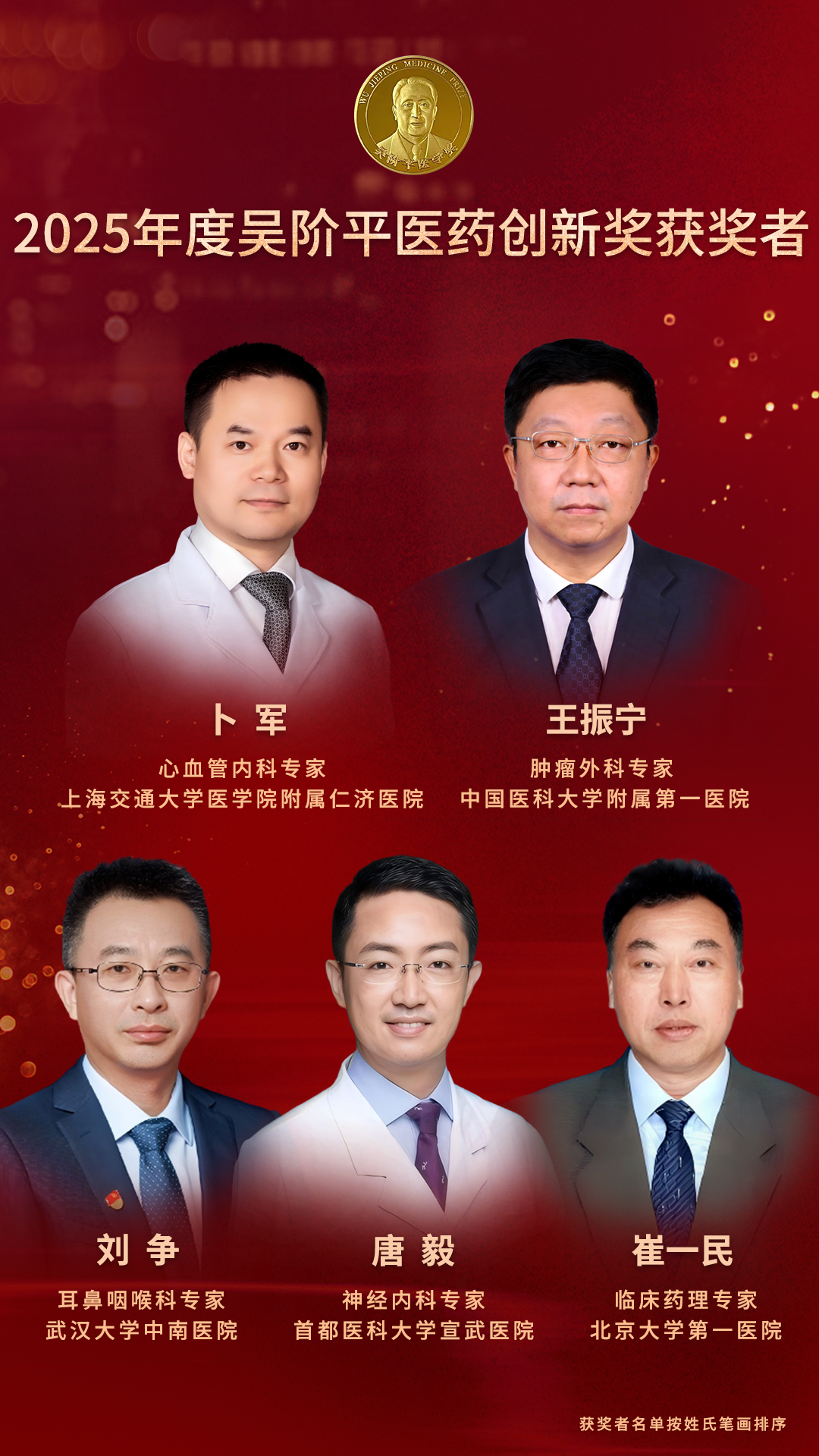 2025年度吳階平醫(yī)藥創(chuàng)新獎授予心血管內(nèi)科專家卜軍教授、腫瘤外科專家王振寧教授、耳鼻咽喉科專家劉爭教授、神經(jīng)內(nèi)科專家唐毅教授、臨床藥理專家崔一民教授,以表彰他們在各自的學科領(lǐng)域作出的重要貢獻。