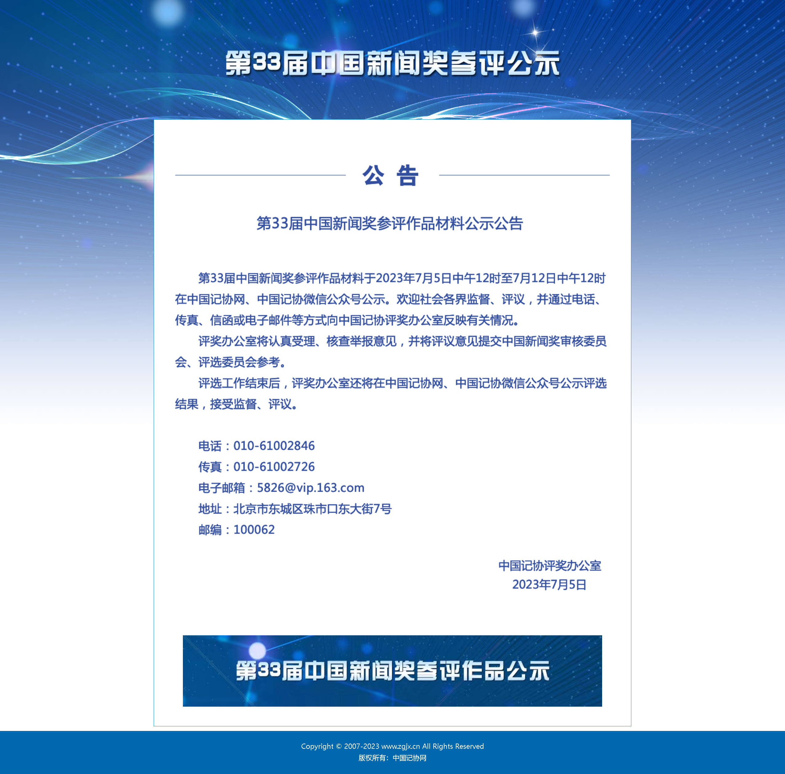 新華社北京7月5日電 7月5日中午12時(shí),第33屆中國(guó)新聞獎(jiǎng)參評(píng)作品材料在中國(guó)記協(xié)網(wǎng)、中國(guó)記協(xié)微信公眾號(hào)進(jìn)行公示。