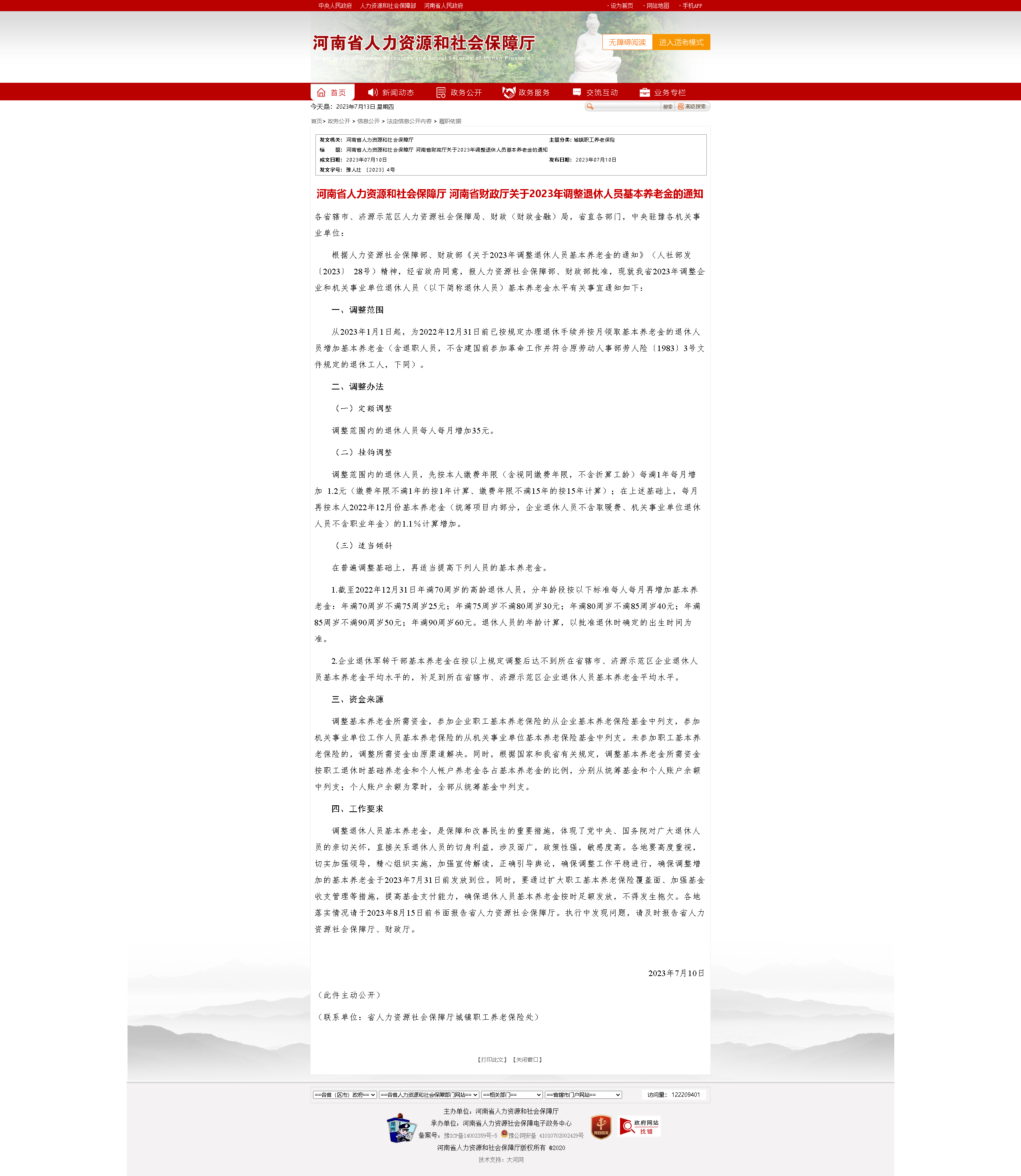 河南省人力資源和社會保障廳 河南省財政廳關于2023年調整退休人員基本養老金的通知