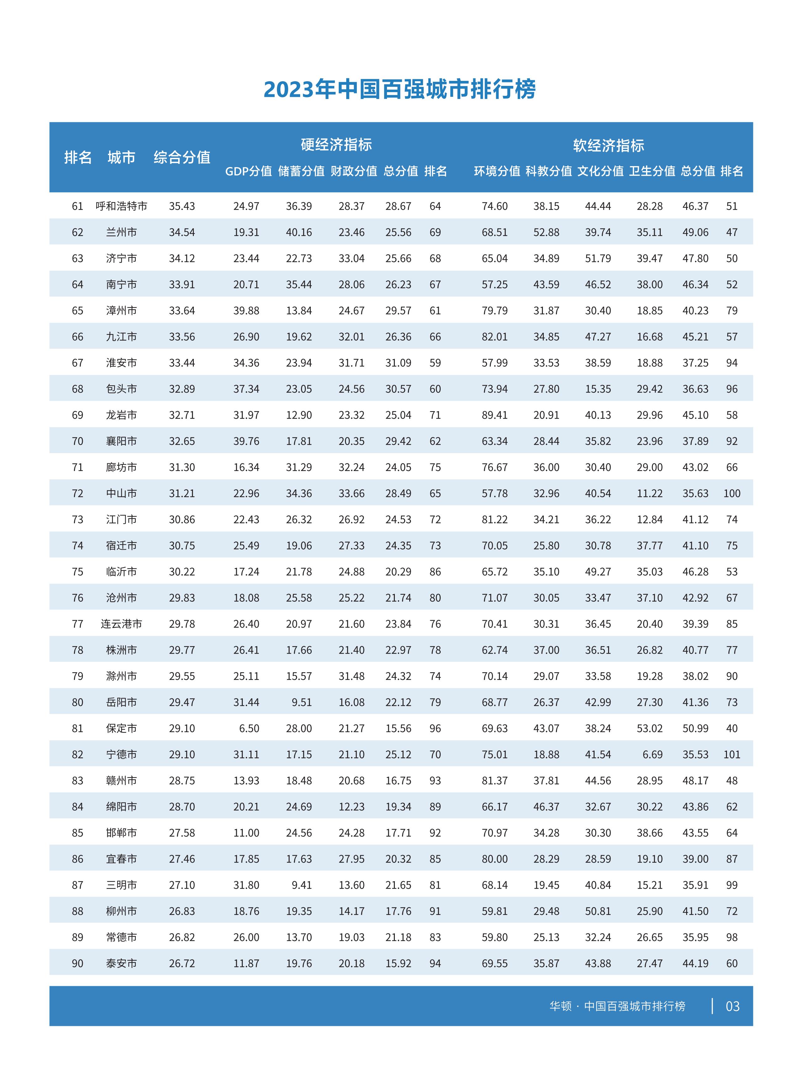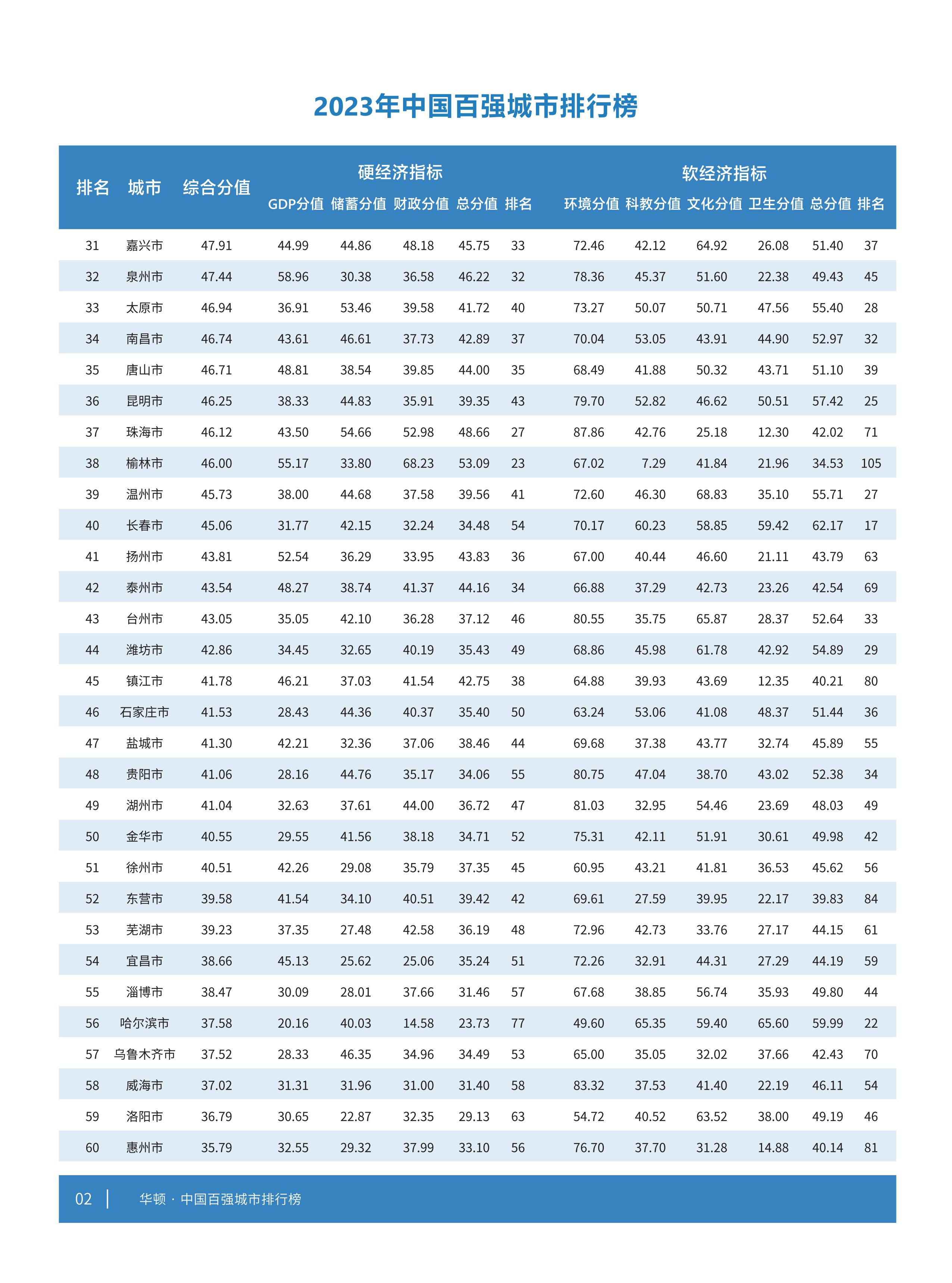 百強城市位次競爭依舊激烈,2023年中國百強城市排行榜上,有36個城市排名上升,40個城市排名下降,24個城市排名保持不變。合肥連續五年排名上升,位次由2018年的第31位連續躍升至2023年的第17位,其中科教指標更是穩居全國第10位。
