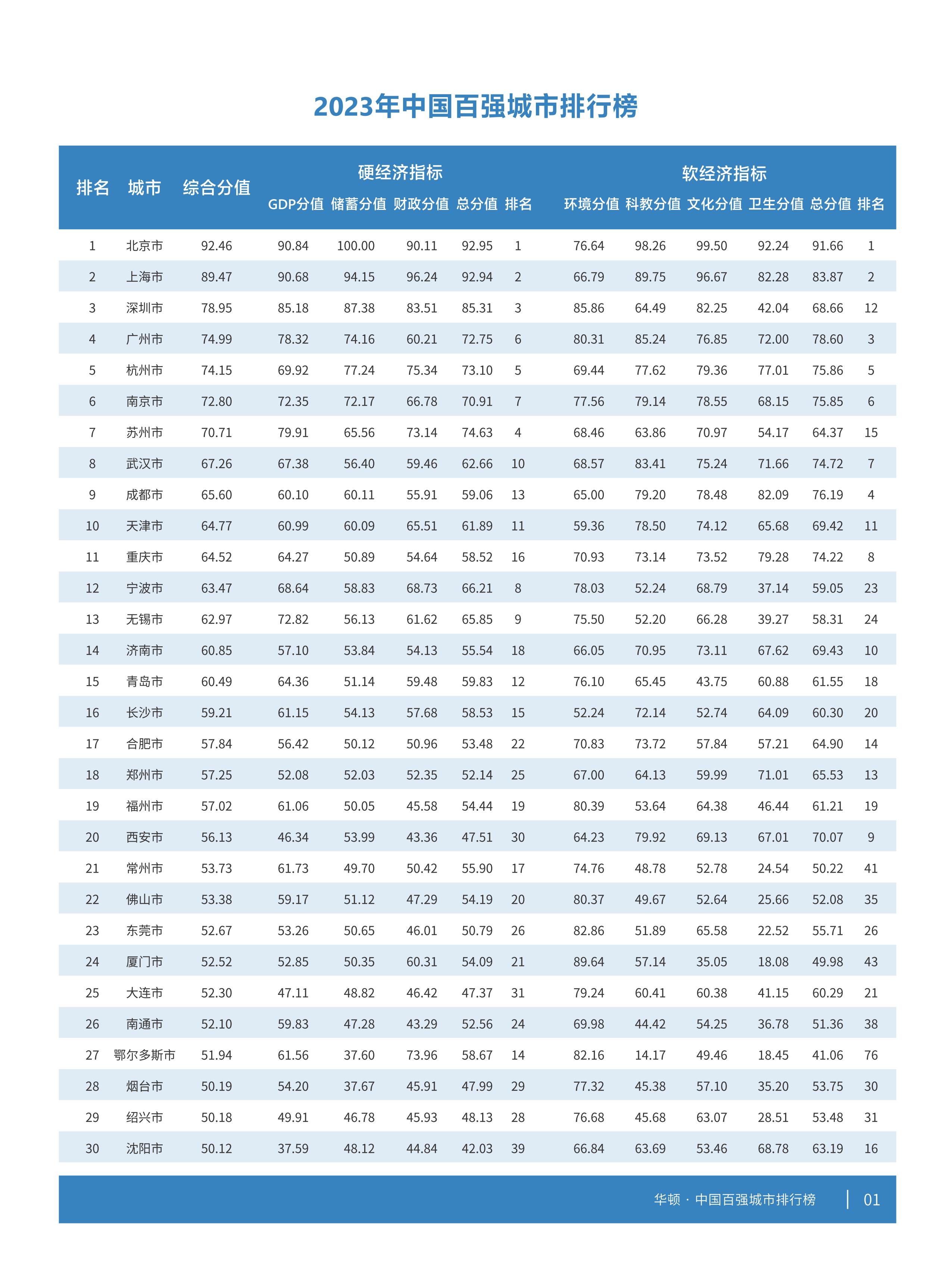 中新網上海7月18日電 (記者 繆璐)2023年中國百強城市排行榜18日在上海發布,這是華頓經濟研究院連續第九年編制發布中國百強城市榜單。榜單顯示,北京、上海繼續穩坐前兩位,大幅領先第三位深圳,合肥連續五年排名上升。