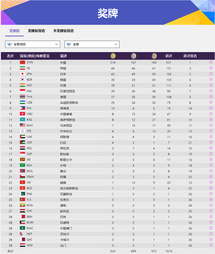 央視網消息:據@杭州第4屆亞殘運會 微博消息,杭州亞殘運會共設置22個大項501小項(其中獎牌小項501個、無獎牌項目10個),產生502枚金牌(1個獎牌小項并列金牌),共打破世界紀錄21次,亞洲紀錄72次,亞殘運會記錄283次。中國隊439人,參加全部22個大項、390個小項,打破世界紀錄13次、亞洲紀錄35次、亞殘運會記錄136次。