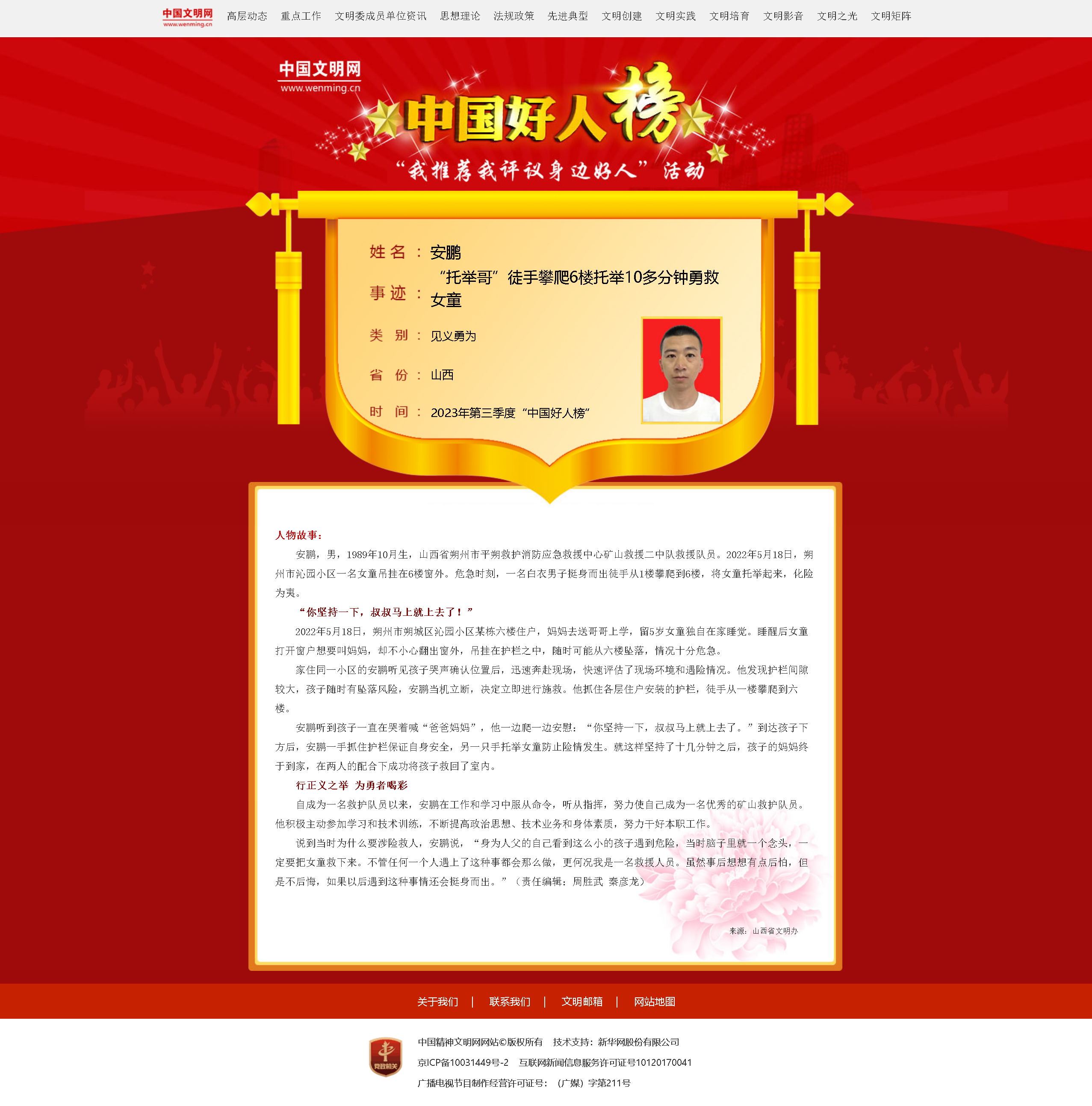 自2008年4月起,中央精神文明建設辦公室已連續15年組織開展網上“我推薦我評議身邊好人”活動,定期發布“中國好人榜”,舉辦“全國道德模范與身邊好人現場交流活動”。截至目前,共有近1.7萬人(組)入選“中國好人榜”,參與互動人次超過100億,在全社會營造了學習中國好人、爭當時代新人的濃厚氛圍。