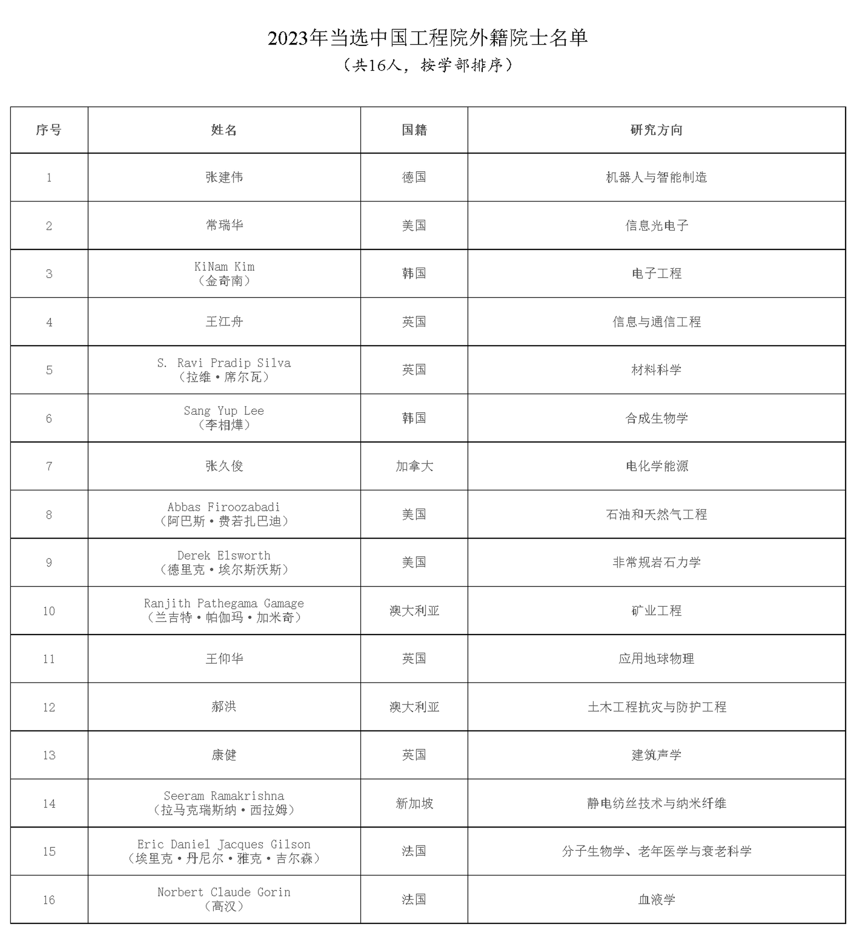 新華社北京11月23日電(記者張泉)中國科學院、中國工程院23日公布了2023年當選外籍院士名單,分別選舉產生30位中國科學院外籍院士、16位中國工程院外籍院士。
