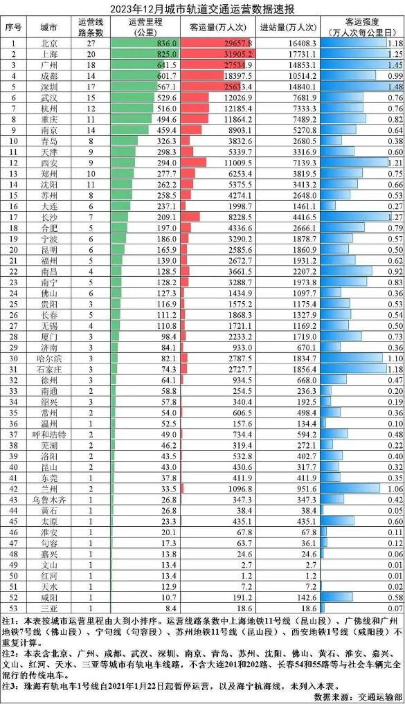 據(jù)交通運輸部有關負責人介紹,2023年12月,我國城市軌道交通新增運營里程250.1公里,新增運營線路6條,為武漢地鐵19號線、重慶地鐵18號線、天津地鐵11號線、鄭州地鐵12號線、貴陽地鐵3號線、南通地鐵2號線;新增運營區(qū)段11個,為北京地鐵11號線西段剩余段、北京地鐵16號線剩余段、北京地鐵17號線北段、廣州地鐵5號線東延段、廣州地鐵7號線二期、深圳地鐵8號線二期、武漢地鐵5號線調(diào)整工程、南京地鐵7號線南段、合肥地鐵2號線延長線、合肥地鐵3號線延長線、哈爾濱地鐵3號線二期西北半環(huán)(中華巴洛克街區(qū)站至北馬路站)。