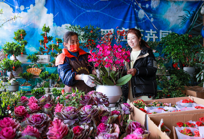 2月4日,在羅莊花卉市場(chǎng),整齊擺放的蝴蝶蘭,色澤鮮艷、外形美觀,不同品種的百合花含苞待放、香氣迷人,還有冬青、杜鵑、茶花等一簇簇鮮花爭(zhēng)奇斗艷、吐露芬芳。因?yàn)殡x城區(qū)較近,便利的交通和品種多樣的花卉,吸引了不少市民前來(lái)選購(gòu),有攜家人前來(lái)挑選的、有三兩好友相約前來(lái)觀賞的,市場(chǎng)內(nèi)熱鬧非凡。為滿足群眾節(jié)日期間購(gòu)買花卉的需求,羅莊花卉市場(chǎng)新引進(jìn)了多個(gè)品種的鮮花種類可供市民挑選購(gòu)買。現(xiàn)在過(guò)春節(jié),越來(lái)越多的市民喜歡用鮮花來(lái)裝點(diǎn)一下居室,討一個(gè)好彩頭。(李紅衛(wèi))