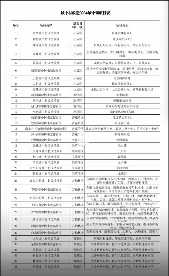 4月9日,一張關于《城中村改造2024年計劃項目表》不脛而走。其中包含了親賢村、狄村、龍保村、西峰村等38個城改項目,囊括了小店區、迎澤區、杏花嶺區、尖草坪區、萬柏林區和晉源區六大主城區。