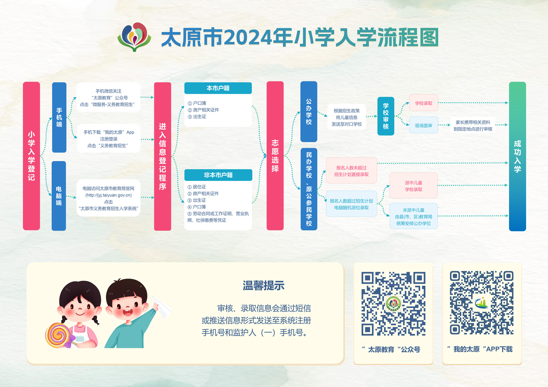 民辦義務(wù)教育學(xué)校網(wǎng)上報(bào)名人數(shù)小于招生計(jì)劃的,全部實(shí)行注冊(cè)入學(xué),空余計(jì)劃不再補(bǔ)招;網(wǎng)上報(bào)名人數(shù)超過(guò)招生計(jì)劃的,全部實(shí)行電腦隨機(jī)派位錄取。民辦小學(xué)搖號(hào)時(shí)間為7月20日,民辦初中搖號(hào)時(shí)間為8月1日。派位結(jié)果在搖號(hào)結(jié)束當(dāng)天通過(guò)太原市教育局官網(wǎng)實(shí)時(shí)向社會(huì)公布。未被民辦義務(wù)教育學(xué)校錄取的適齡兒童、小學(xué)畢業(yè)生,由戶(hù)籍或?qū)W籍所在縣(市、區(qū))教育局統(tǒng)籌安排,不得擇校。