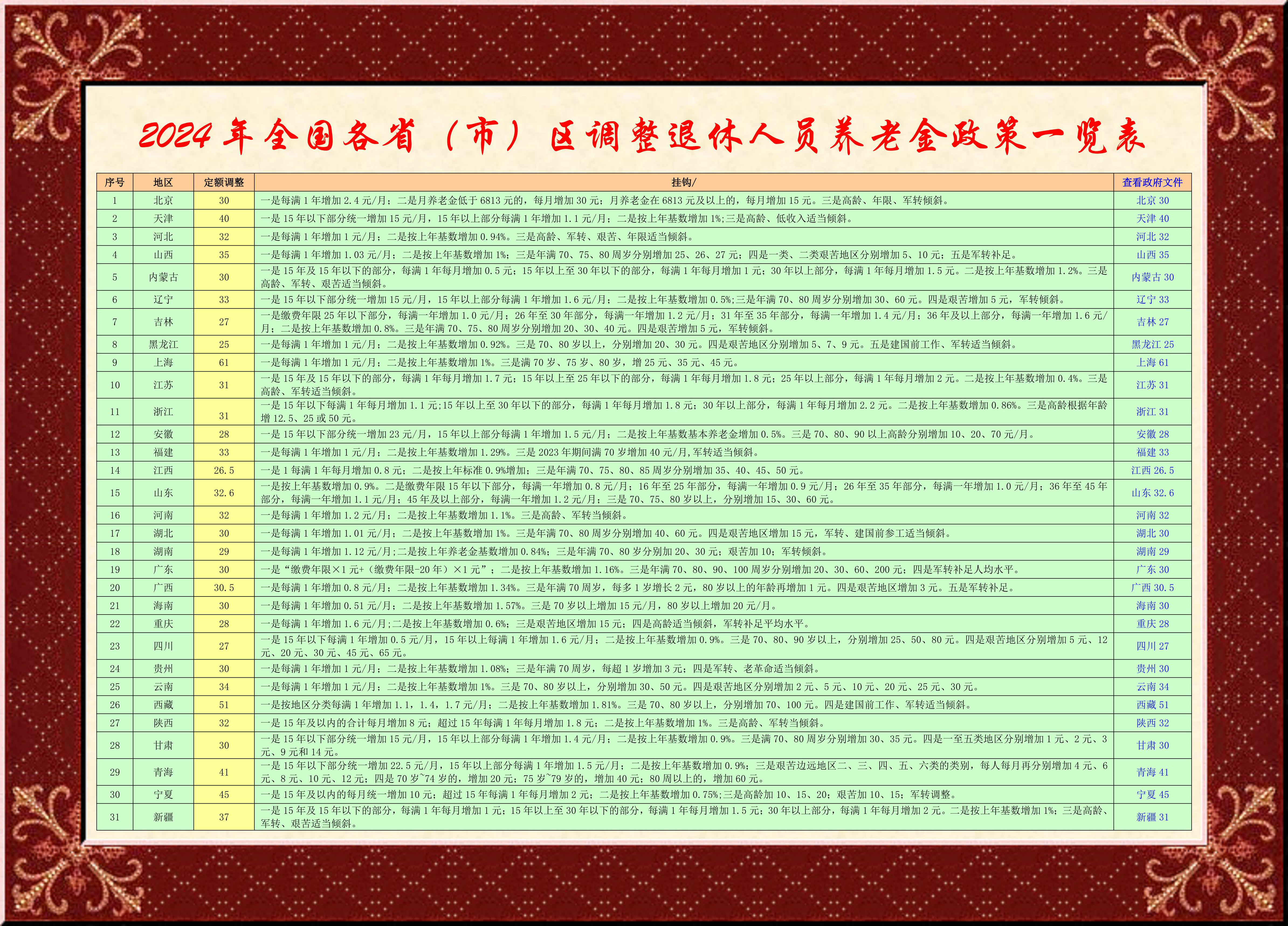 2024年全國31個省(市)自治區退休人員調整基本養老金已經落實到位,一年一度1.4億退休人員得到了實實在在的實惠,這是黨中央和各級人民政府把人民生活放在第一位的偉大功績,可圈可點,令人欣慰!