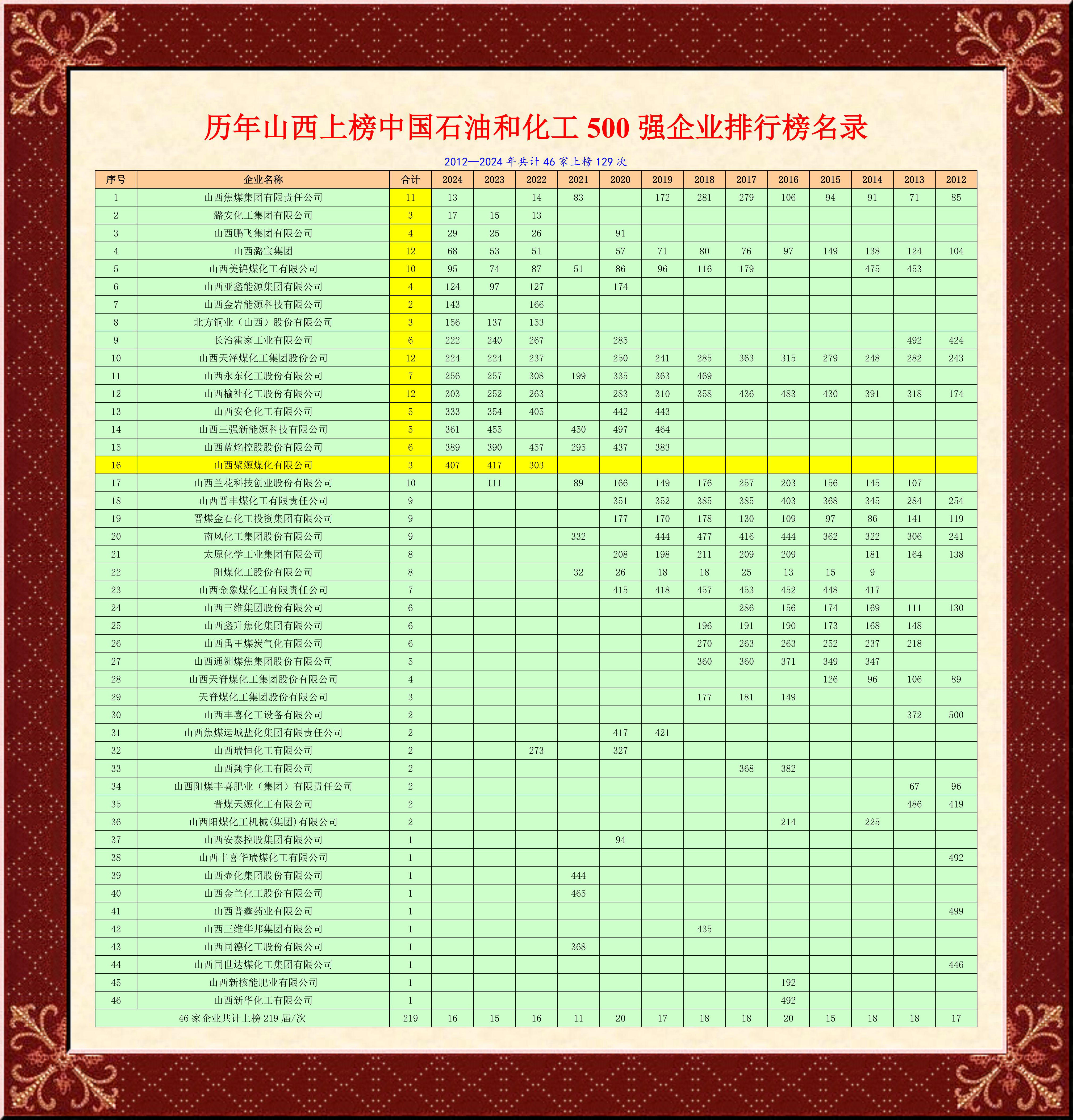 昨天到今天,編輯了2012—2024中國石油和化工500強排行榜。山西煤炭大省今年16家企業上榜,看看他們都是誰?