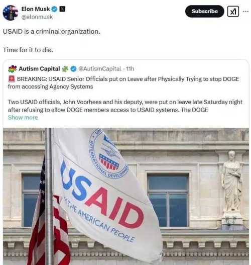 政府效率部負(fù)責(zé)人馬斯克在X上發(fā)文稱,美國國際開發(fā)署“是一個犯罪組織,是時候讓它消亡了”網(wǎng)絡(luò)截圖