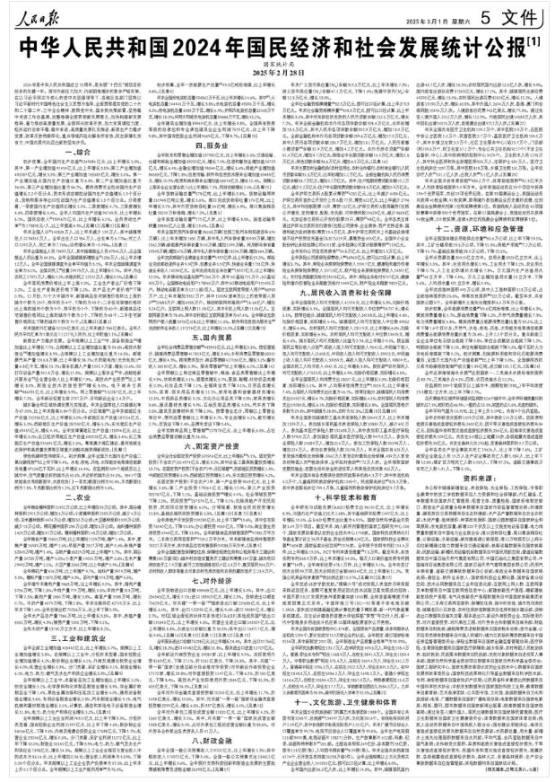 今天,國家統計局公布了《中華人民共和國2024年國民經濟和社會發展統計公報》。
