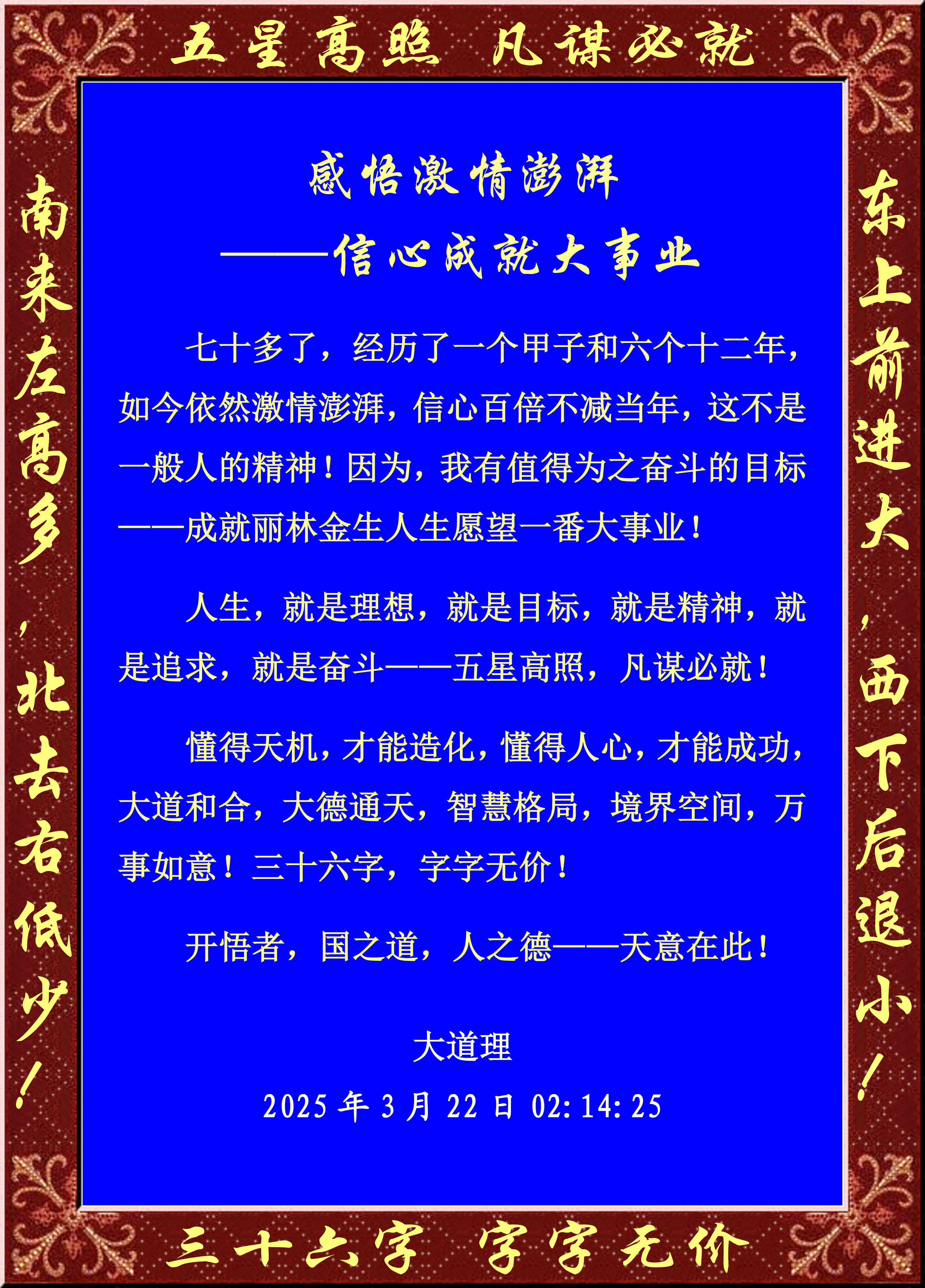 人生,就是理想,就是目標,就是精神,就是追求,就是奮斗——五星高照,凡謀必就!懂得天機,才能造化,懂得人心,才能成功,大道和合,大德通天,智慧格局,境界空間,萬事如意!三十六字,字字無價!