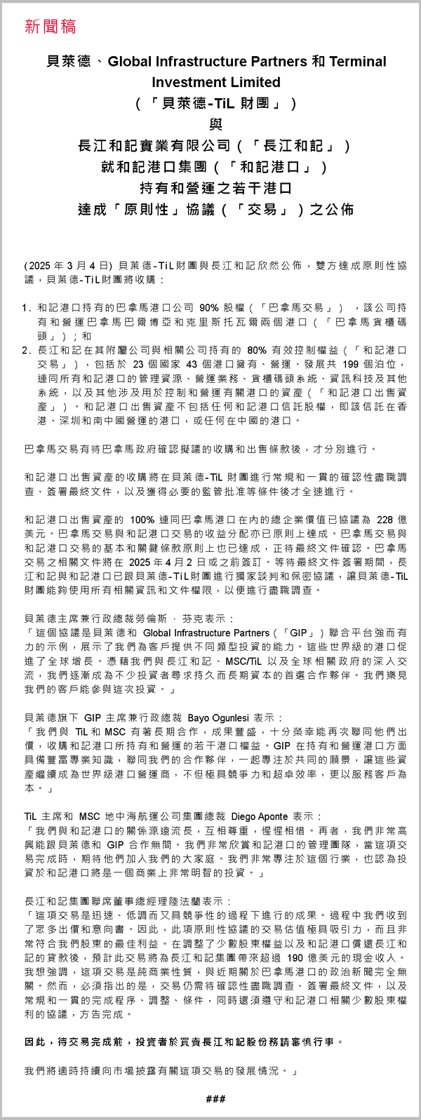 對此,李嘉誠始終保持沉默,長和更是以“在商言商”進行搪塞。但戲劇性轉折來得猝不及防。就在輿論壓力攀至頂點時,市場傳出大陸國有航運企業擬接手部分港口的消息。長和雖未官宣,卻已悄然撤回向貝萊德轉讓葵青碼頭股權的計劃。