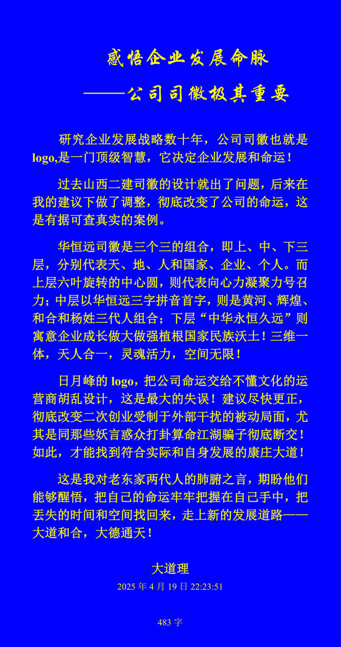 日月峰的logo,把公司命運(yùn)交給不懂文化的運(yùn)營商胡亂設(shè)計(jì),這是最大的失誤!建議盡快更正,徹底改變二次創(chuàng)業(yè)受制于外部干擾的被動(dòng)局面,尤其是同那些妖言惑眾打卦算命江湖騙子徹底斷交!如此,才能找到符合實(shí)際和自身發(fā)展的康莊大道!