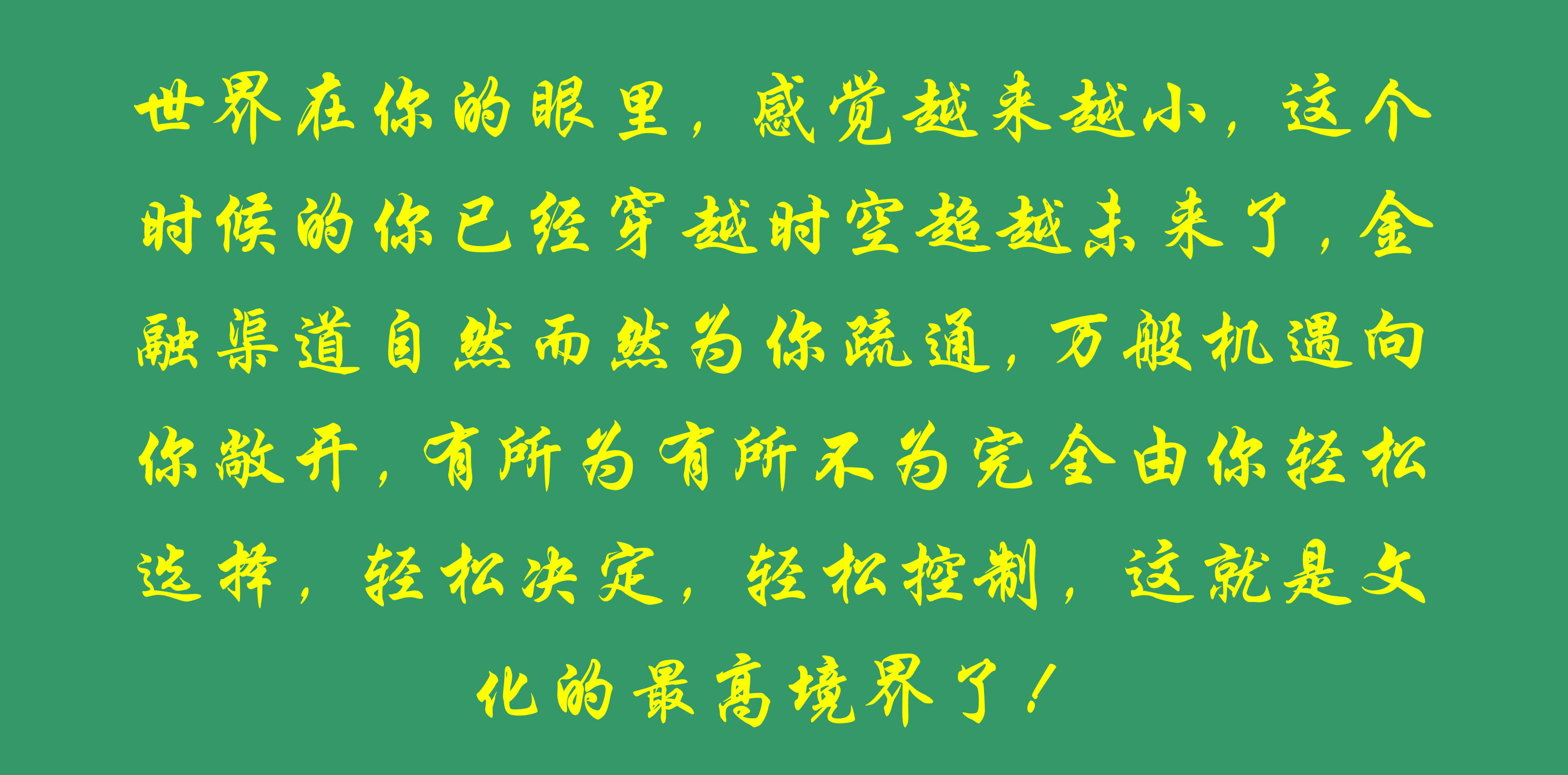 做一個(gè)企業(yè)家,一個(gè)世界級(jí)的大企業(yè)家,必須有高度的覺(jué)悟,高度的責(zé)任,高度的主動(dòng),這就是使命感和事業(yè)心的高度統(tǒng)一,高度融合,高度完善。上升到這個(gè)高度,你的公司才能越做越大,越做越強(qiáng),越做越優(yōu)。世界在你的眼里,感覺(jué)越來(lái)越小,這個(gè)時(shí)候的你已經(jīng)穿越時(shí)空超越未來(lái)了,金融渠道自然而然為你疏通,萬(wàn)般機(jī)遇向你敞開(kāi),有所為有所不為完全由你輕松選擇,輕松決定,輕松控制,這就是文化的最高境界了!