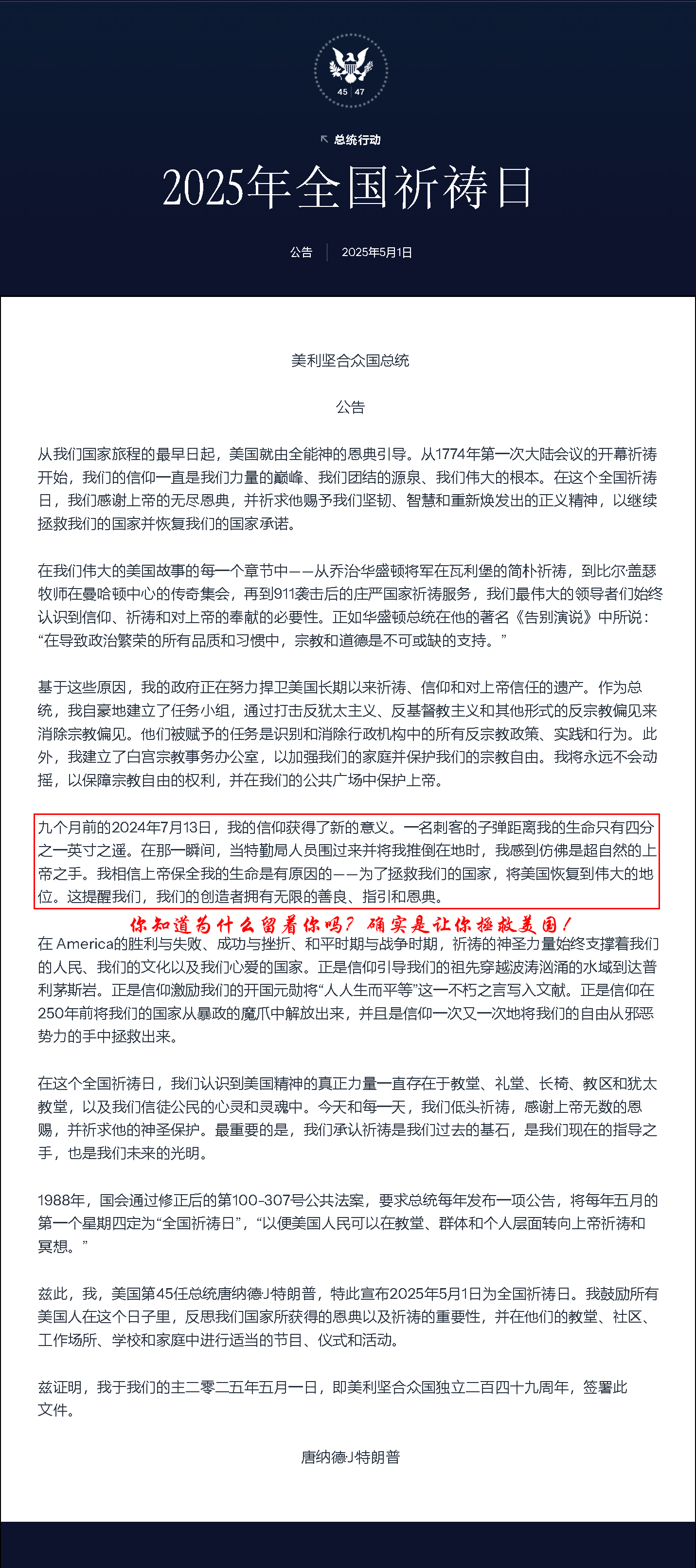 特朗普五月一日公告,字里行間為自己歌功頌德,卻忘記了上天留他一命的使命和任務是什么?!