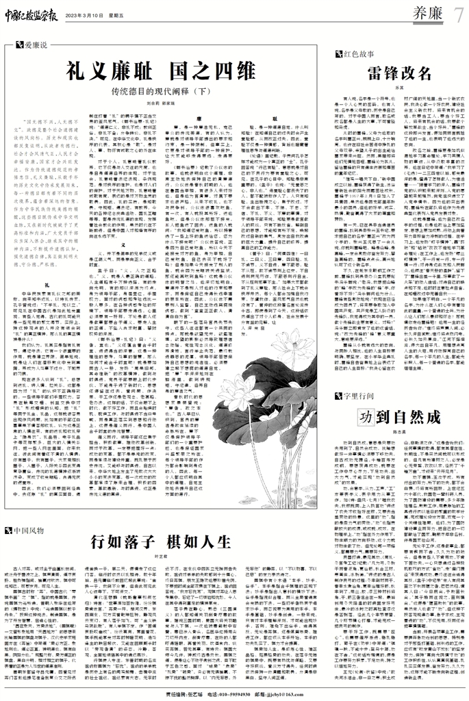 《管子》曰:“何謂四維?一曰禮,二曰義,三曰廉,四曰恥,禮不逾節,義不自進,廉不蔽惡,恥不從枉。故不逾節則上位安,不自進則民無巧詐,不蔽惡則行自全,不從枉則邪事不生。”如果大家都做到了禮義廉恥,那么社會上下就會秩序井然,每個人都會加強自我約束,爾虞我詐、歪風邪氣自然也就沒有了。管仲的這段著名言論流傳千古,即使是到了今天,這段話依然道出了對個人修身、社會發展十分有益的見解,讓人深受啟發。