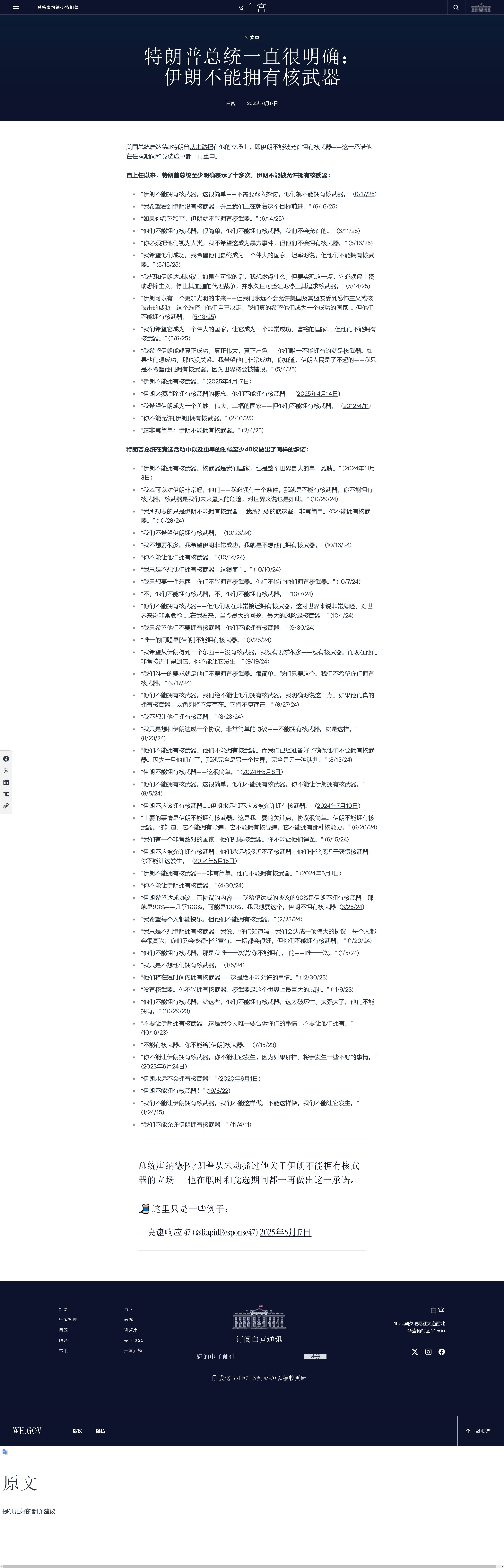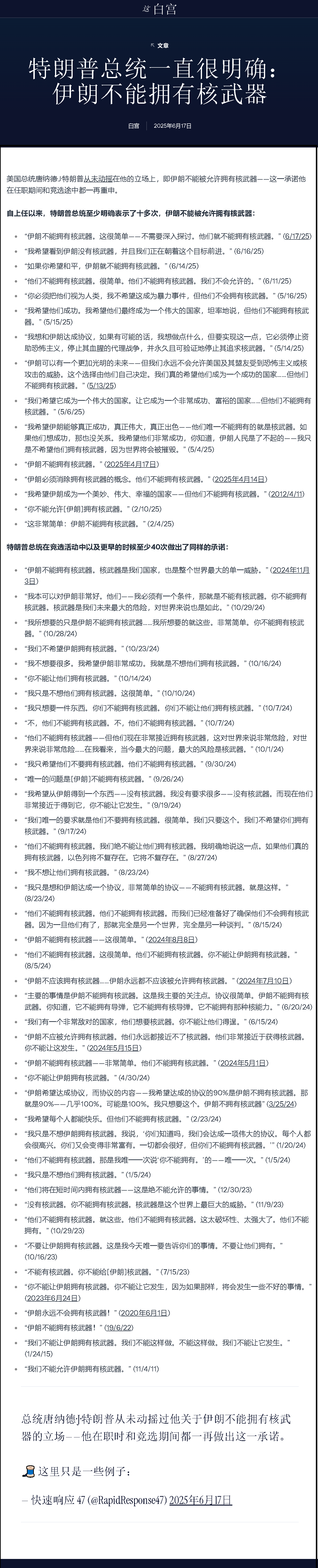 阻止伊朗獲得核武器一直是歷任美國政府和其他西方國家的目標(biāo)。自今年4月以來,美伊雙方已在阿曼斡旋下進(jìn)行了五輪核談判,但未取得實(shí)質(zhì)性突破。美國希望伊朗徹底終止可用于制造核武器的鈾濃縮項(xiàng)目,而伊朗則堅(jiān)稱要保留該項(xiàng)目,并要求美方解除制裁,作為其在核計(jì)劃上做出任何讓步的交換條件。因以色列6月13日突襲,美伊原定于15日舉行的第六輪談判被取消。