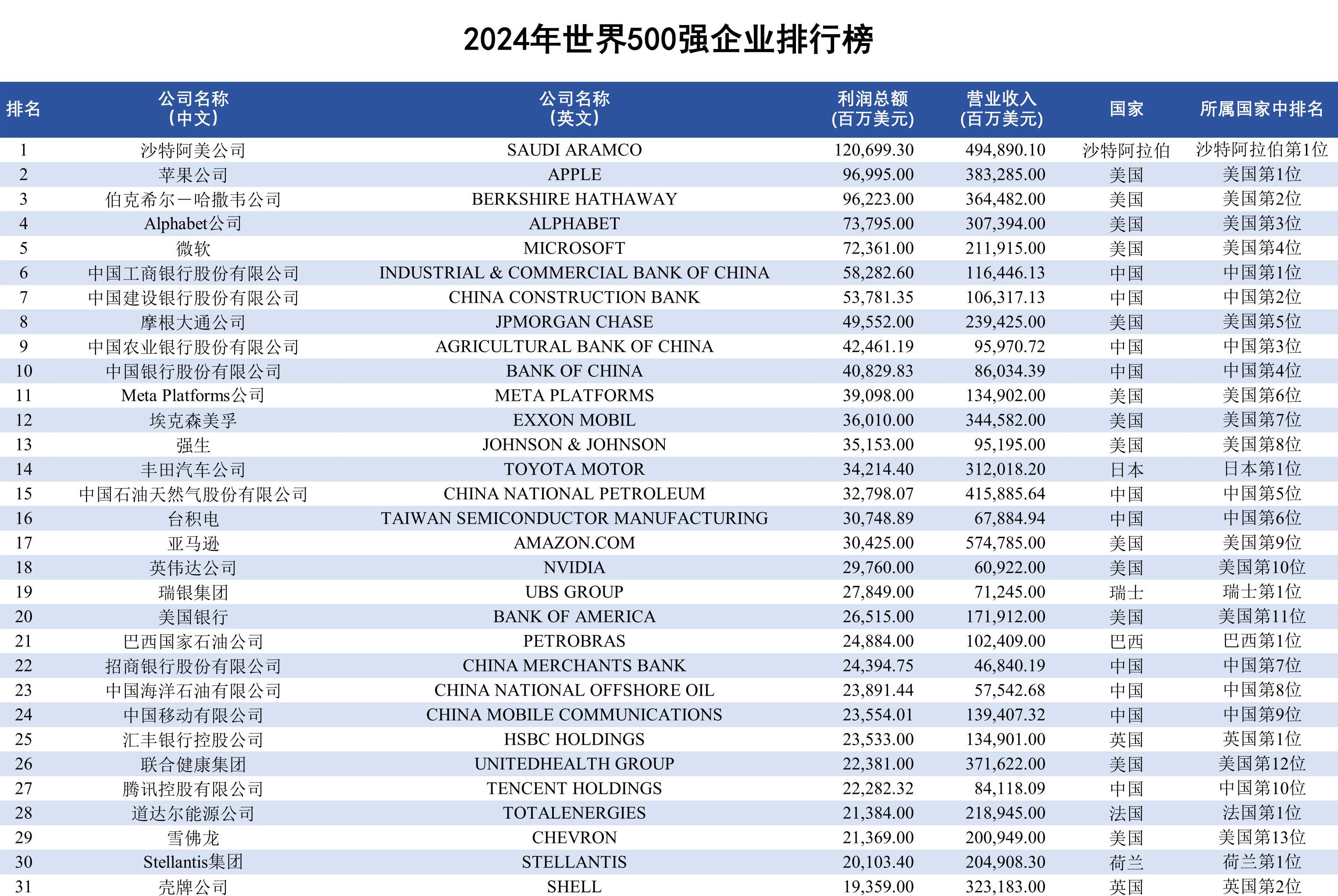 華頓版2024年世界500強企業排行榜中,所有上榜企業創造的利潤總額合計為3.82萬億美元,營業收入超32萬億美元,上榜門檻(最低利潤額)為21.67億美元。