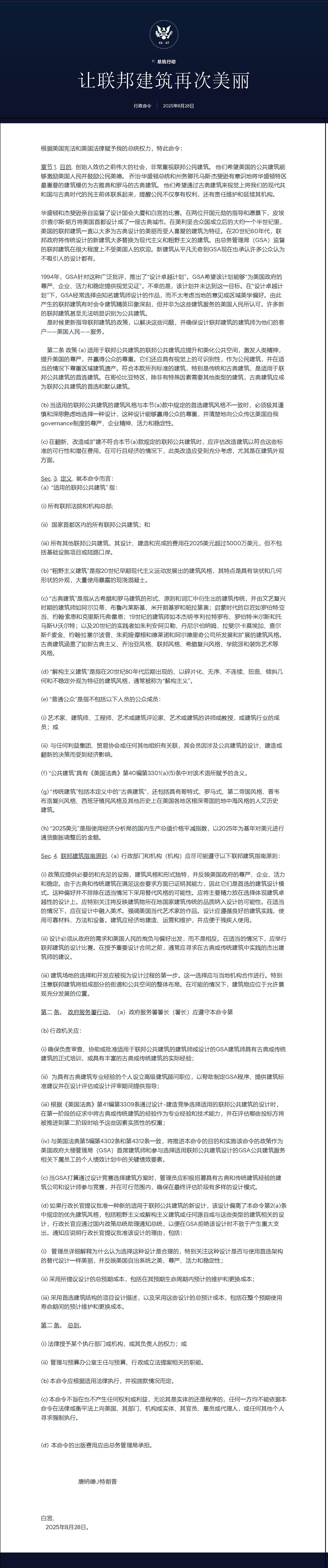 (d) 如果行政長官提議批準一種新的適用于聯邦公共建筑的新設計,該設計偏離了本命令第2(a)條中規定的優先建筑風格,包括粗野主義或解構主義建筑或任何源自或與這些類型的建筑相關的設計,行政長官應通過國內政策總統助理通知總統,以便在GSA拒絕該設計時不致于產生重大支出。通知應說明行政長官提議批準該設計的理由,包括: