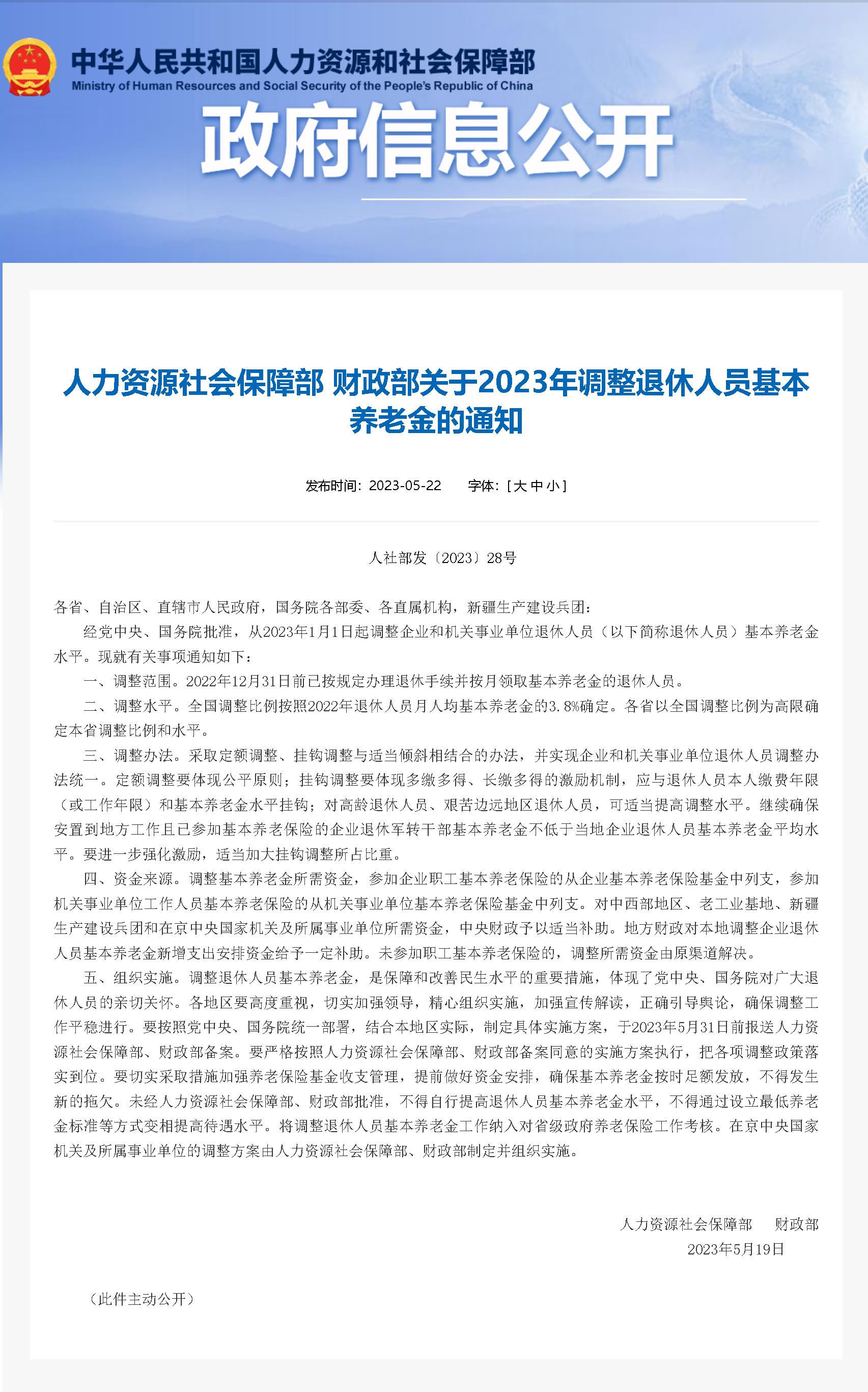 今天,人社部、財(cái)政部公布了今年繼續(xù)調(diào)整退休人員基本養(yǎng)老金的通知。這是繼2005年以來全國連續(xù)第19年增加退休人員基本養(yǎng)老金,從2004年人均714元到今年3315元,全國養(yǎng)老金平均增加了2601元,提高了3.64倍。