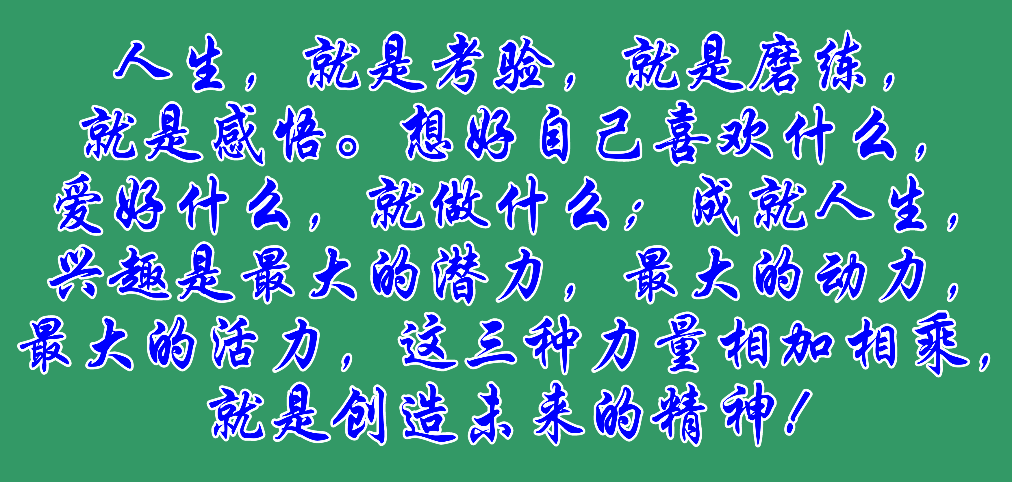 人生,就是考驗,就是磨練,就是感悟。想好自己喜歡什么,愛好什么,就做什么;成就人生,興趣是最大的潛力,最大的動力,最大的活力,這三種力量相加相乘,就是創造未來的精神!