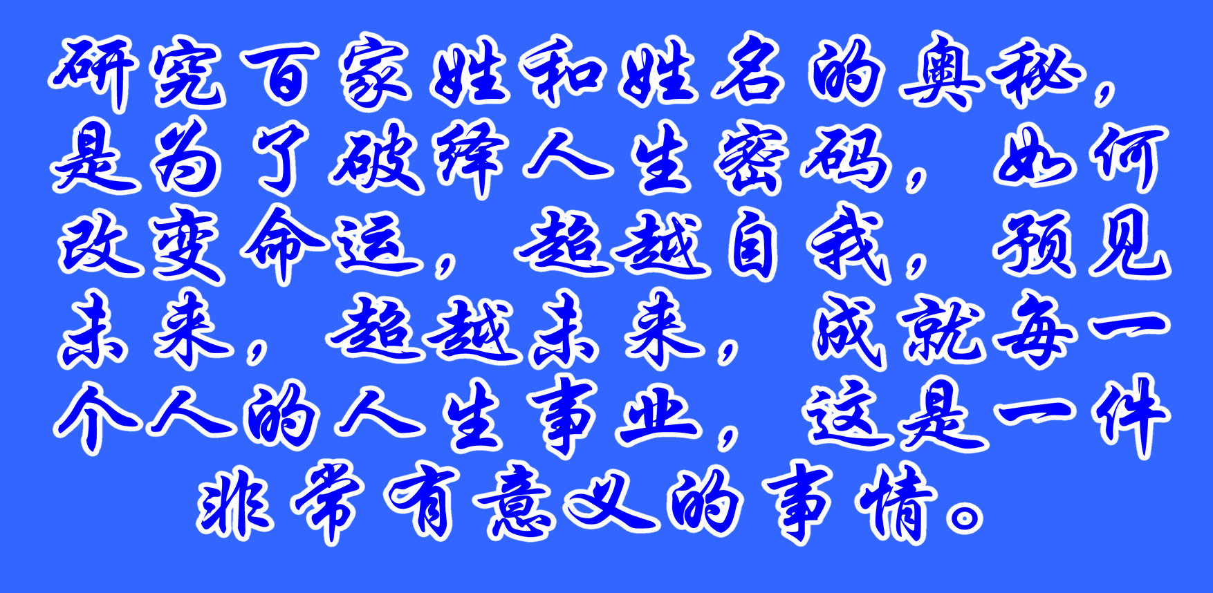 我研究百家姓和姓名的奧秘,是為了破譯人生密碼,如何改變命運(yùn),超越自我,預(yù)見未來,超越未來,成就每一個(gè)人的人生事業(yè),這是一件非常有意義的事情。