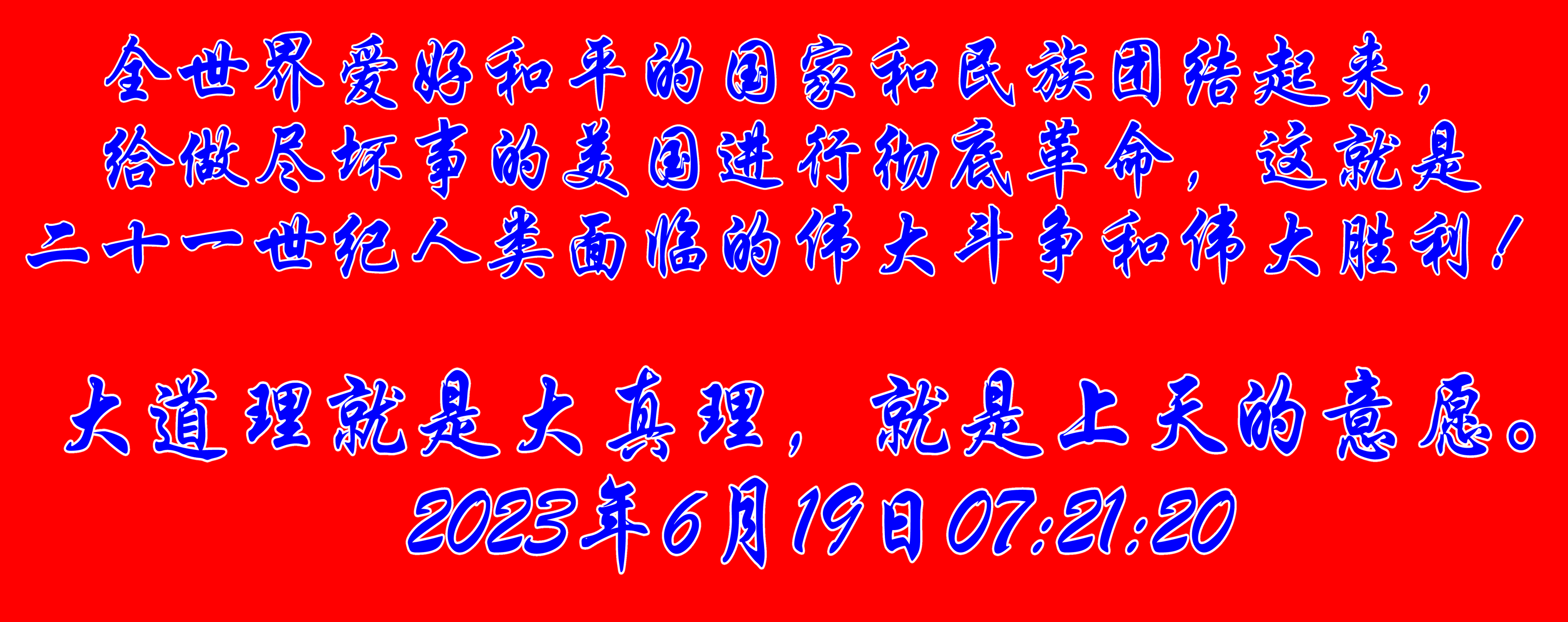 近百年世界和人類歷史 告訴我們,只有美國資本主義滅亡,世界才能安寧,人類才有希望,這是世界給我們和人類進步的必答題,而這道題,需要全世界愛好和平的國家和民族團結起來,給做盡壞事的美國進行徹底革命,這就是二十一世紀人類面臨的偉大斗爭和偉大勝利!