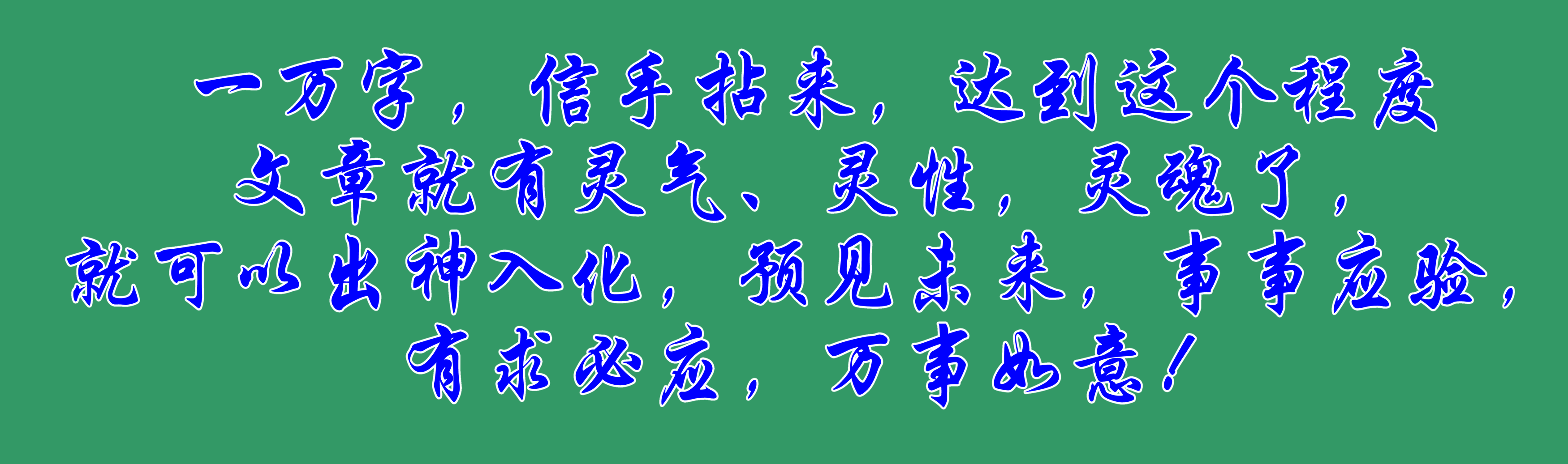 說到這里,達到這個水平,需要有實現目標的真功夫,那就是文化!偉大的事業必須有偉大的文化,事業的成功依然需要有成功事業的文化!文化來源于學習,來源于實踐,來源于刻苦鉆研,勤學苦練!讀書破萬卷,下筆如有神,就是這個道理!一萬字,信手拈來,達到這個程度,文章就有靈氣、靈性,靈魂了,就可以出神入化,預見未來,事事應驗,有求必應,萬事如意!