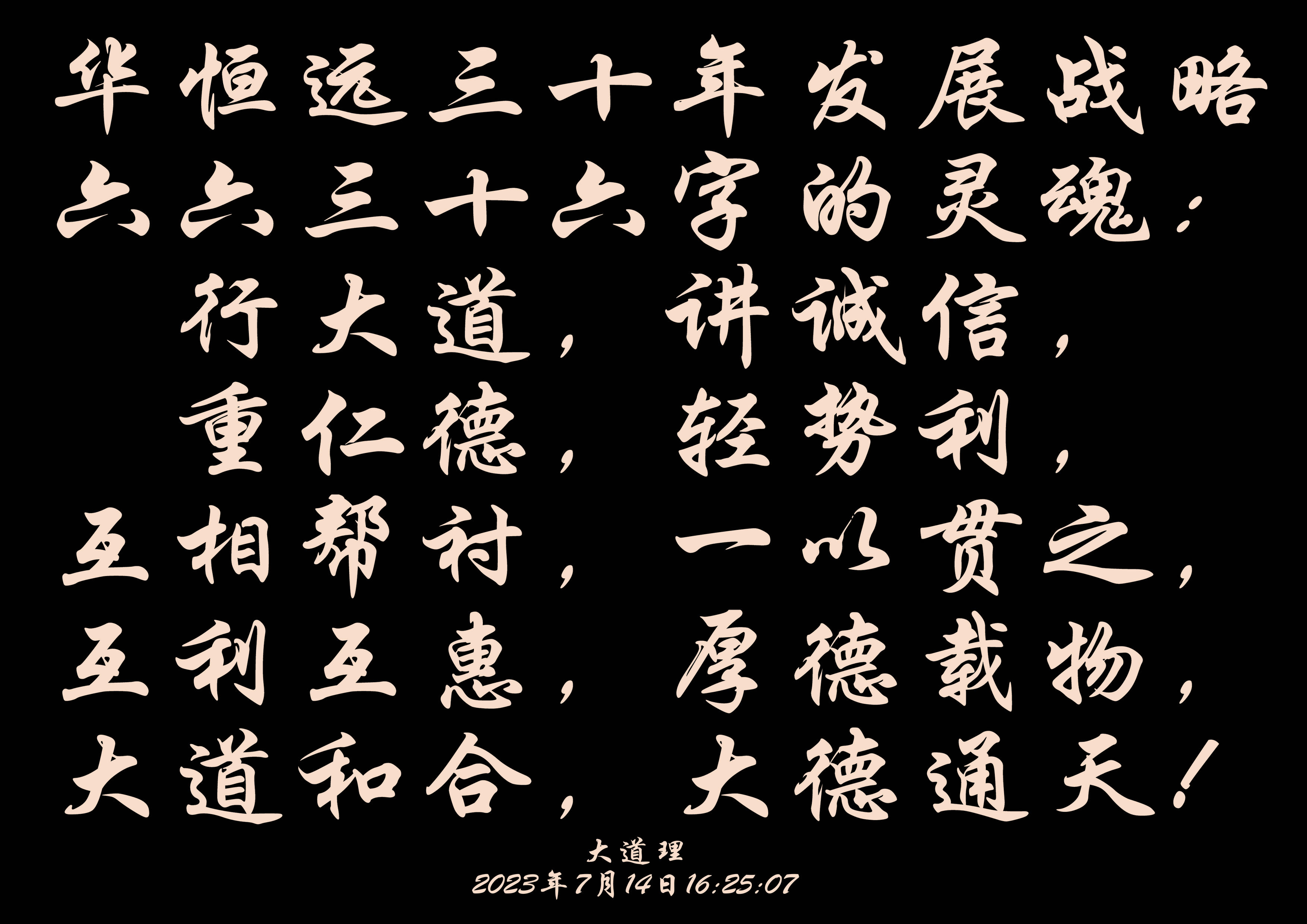 我們制定華恒遠(yuǎn)三十年發(fā)展戰(zhàn)略規(guī)劃,是從著眼當(dāng)下展望未來的高度,從符合實(shí)際的角度,適合自己的深度,知近觀遠(yuǎn),統(tǒng)籌兼顧;既不急功近利,也不急于求成,還不好大喜功,更不鋌而走險,決不畏縮不前,這五個“不”,來衡量和考慮。同時,要堅持一貫:做有準(zhǔn)備的事,做有把握的事,做有前途的事,做有利人的事,做有利己的事;這五個“做”,即彰現(xiàn)華恒遠(yuǎn)企業(yè)文化的追求,又昭示華恒遠(yuǎn)企業(yè)發(fā)展戰(zhàn)略六六三十六字的靈魂:行大道,講誠信,重仁德,輕勢利,互相幫襯,一以貫之,互利互惠,厚德載物,大道和合,大德通天!