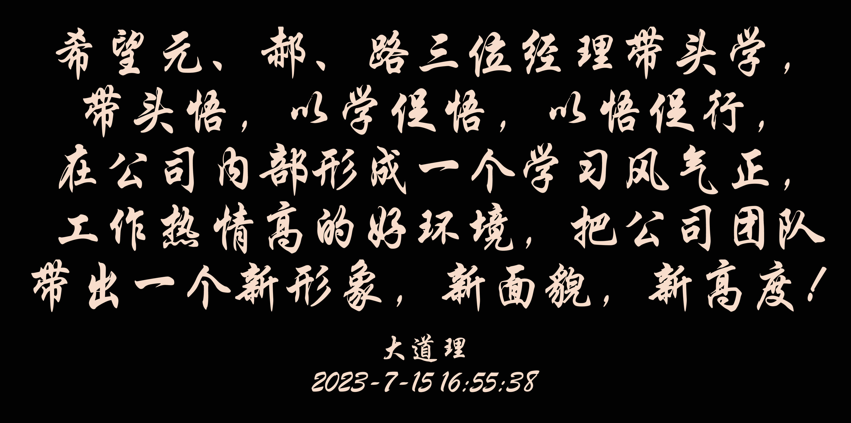 認真學習總書記講話精神,深刻領會講話核心內(nèi)涵和要義,提高理解能力和執(zhí)行能力,把華恒遠建設好是學習根本要求,希望元、郝、路三位經(jīng)理帶頭學,帶頭悟,以學促悟,以悟促行,在公司內(nèi)部形成一個學習風氣正,工作熱情高的好環(huán)境,把公司團隊帶出一個新形象,新面貌,新高度!