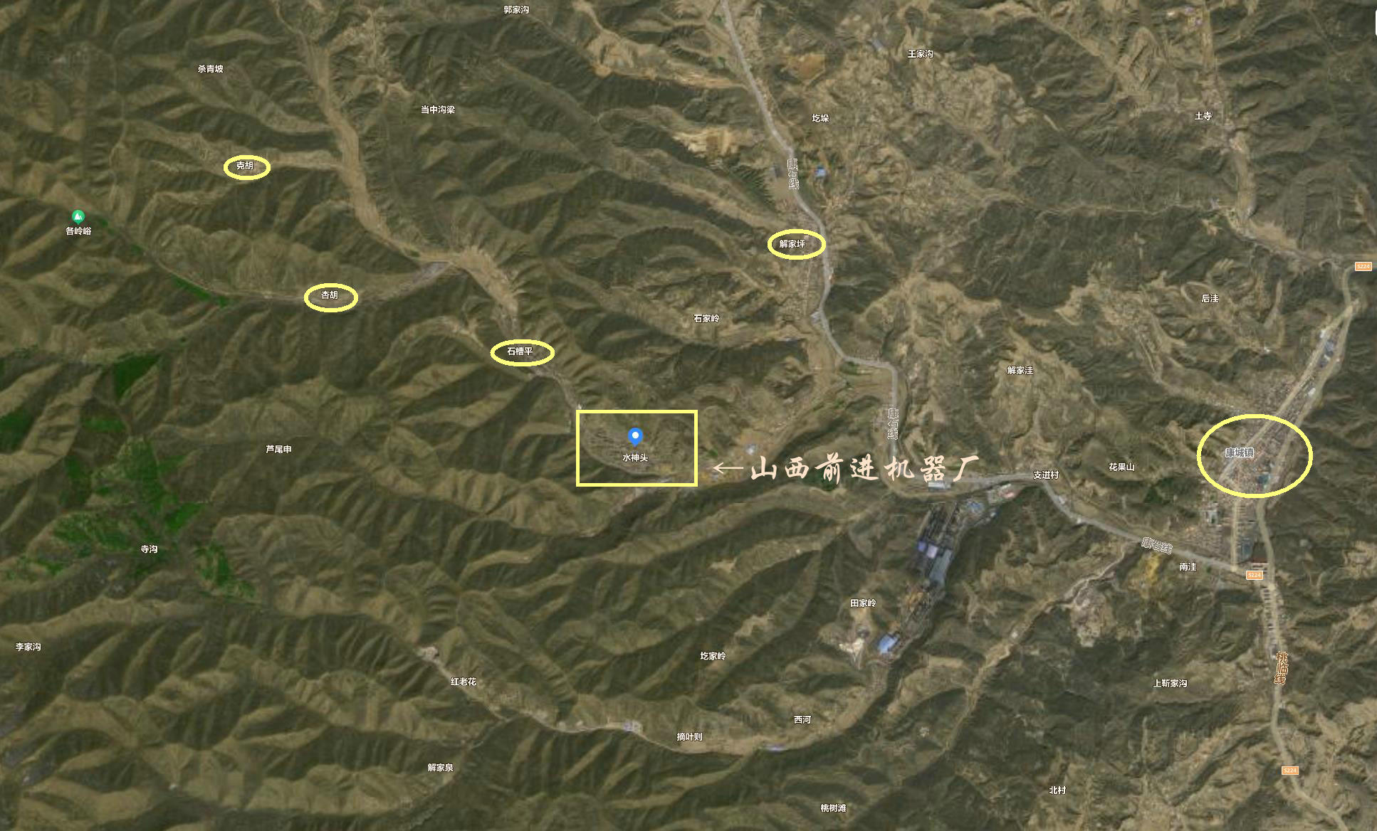 下面衛星圖中圈的地方,西北面石槽平因一眼泉水和石槽平而得名,位于山間小道路旁。杏胡和克胡則是兩個自然村。哪里的村民純樸善良,看到我們進村,都站在家門口觀望,大姑娘小媳婦穿著牡丹花被面那種布的衣服,別有一番風趣。在城市長大的我,第一次看到這樣的著裝,可謂是聞所未聞!老鄉看到我和同伴抬頭看樹上黃橙橙的杏子,立刻拿一根長長的竹桿,噼里啪啦一陣子打的杏兒啪、啪落了一地,“吃呀!”他說。給人家錢,說什么都不要!一塊錢,核桃100個,雞蛋20個,我倆滿載而歸!水神頭往東北4里,是行政村解家坪,飯店、百貨商店、郵局、理發店一應俱全。這是我和師傅、師弟,星期天經常光顧的地方,吃頓飯,買些日用品,少不了提個生豬頭回來,那是上海楊老師傅的最愛!往正東10里地的康城鎮,那是回太原的必經之路,少不了在鎮上買一些太原市買不到的汾酒、竹葉青酒,大前門煙,孝敬父親;還有給小外甥女的奶粉和白糖。附帶核桃,雞蛋這些太原的稀罕物。