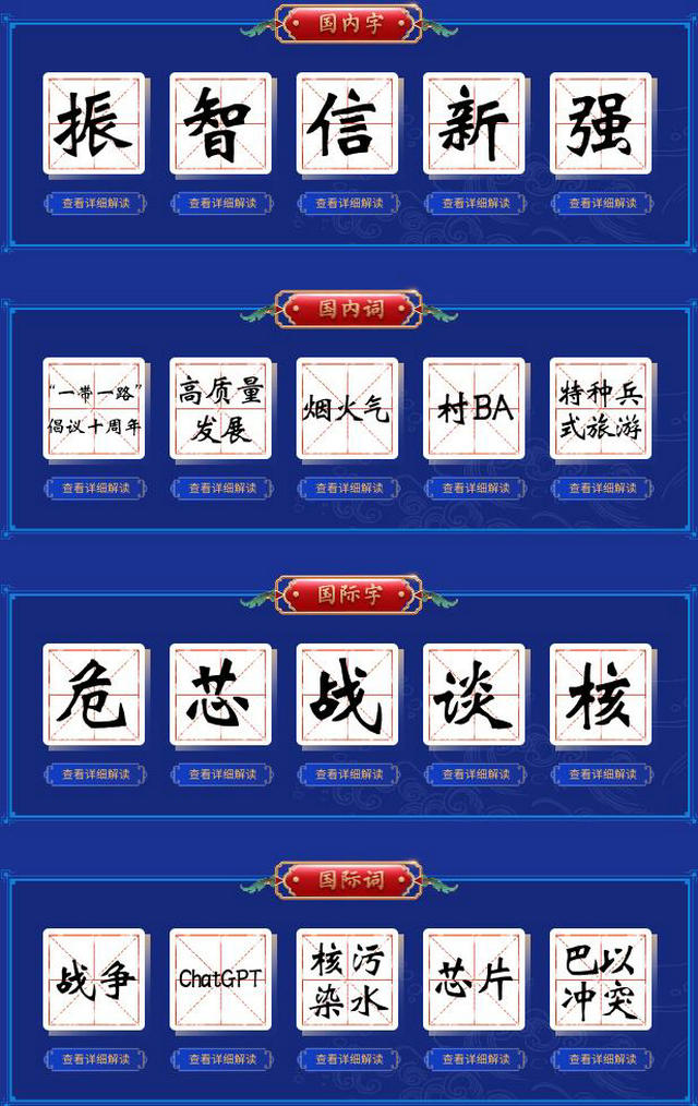 前五位年度國內候選字為“振”“智”“信”“新”“強”,前五位年度國內候選詞為“‘一帶一路’倡議十周年”“高質量發展”“煙火氣”“村BA”“特種兵式旅游”;前五位年度國際候選字為“危”“芯”“戰”“談”“核”,前五位年度國際候選詞為“戰爭”“ChatGPT”“核污染水”“芯片”“巴以沖突”。