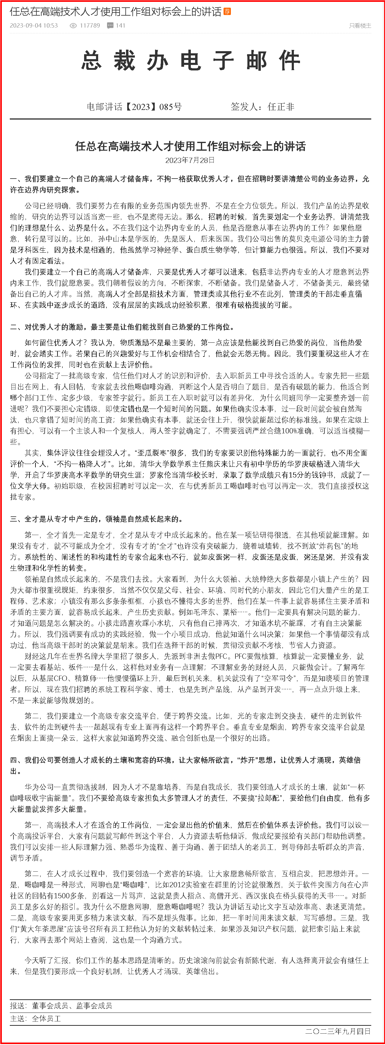 公司在前進,干部也要與時俱進,不僅要敢戰,更要善戰。干部要有清晰的戰略方向和工作思路,做好作戰地圖,盡快完成針對新業務、新技術的知識升級和能力轉型,要主動擔負起更大的責任,在關鍵戰場、關鍵時期建功立業。公司干部選拔政策也正在優化,強調責任結果貢獻,堅持選拔制,落實干部履歷表制度。將軍是打出來的,我們要從戰場中選拔干部,只考核那些做出了貢獻的干部,并盡可能讓更多做出貢獻的英雄浮現和成長起來。我們要整編出一支能夠領導現代化作戰的干部隊伍,帶領公司走向新的成功。